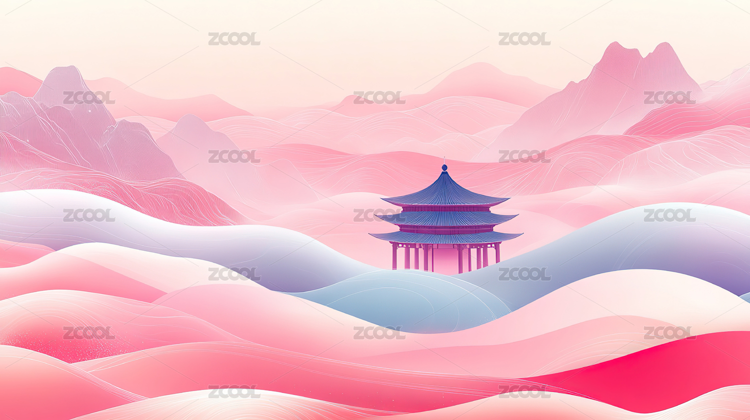 粉蓝色山水楼阁插画