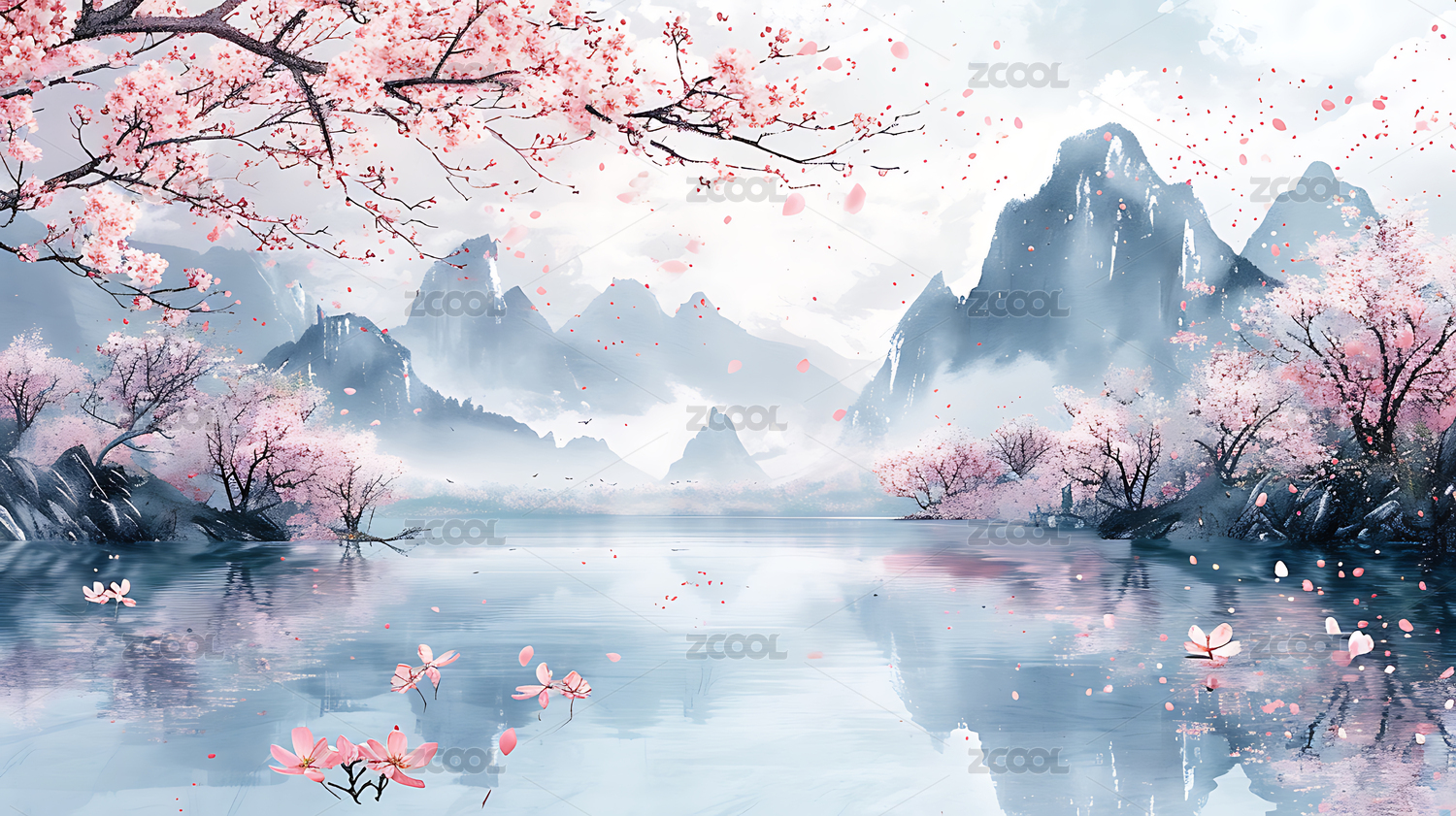 粉色樱花山脉意境景色