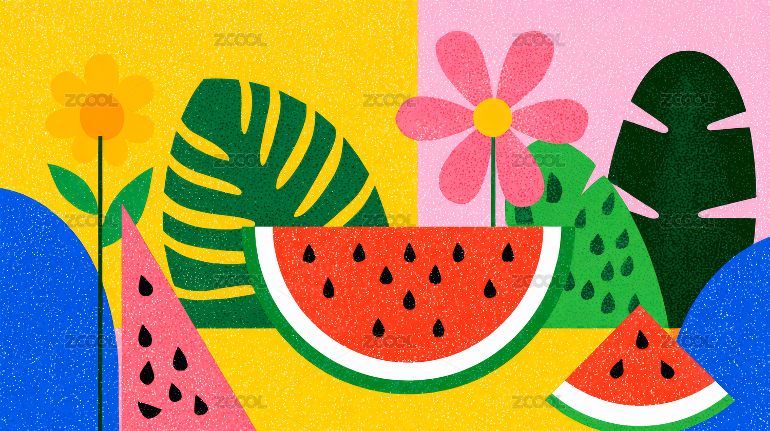 西瓜和花朵叶子在彩色背景上