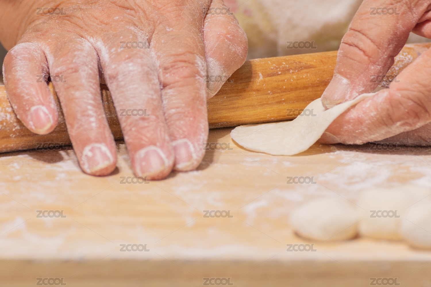 中国家庭主妇正在砧板上擀饺子皮准备包饺子