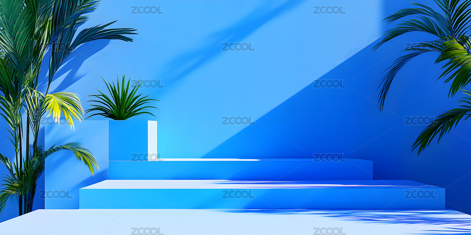 蓝色调阶梯与棕榈树场景
