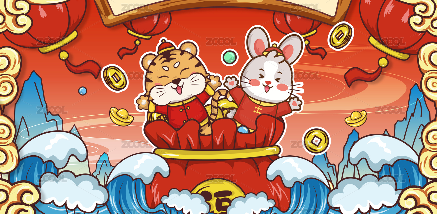 龙年十二生肖金币元宝灯笼春节矢量插画背景