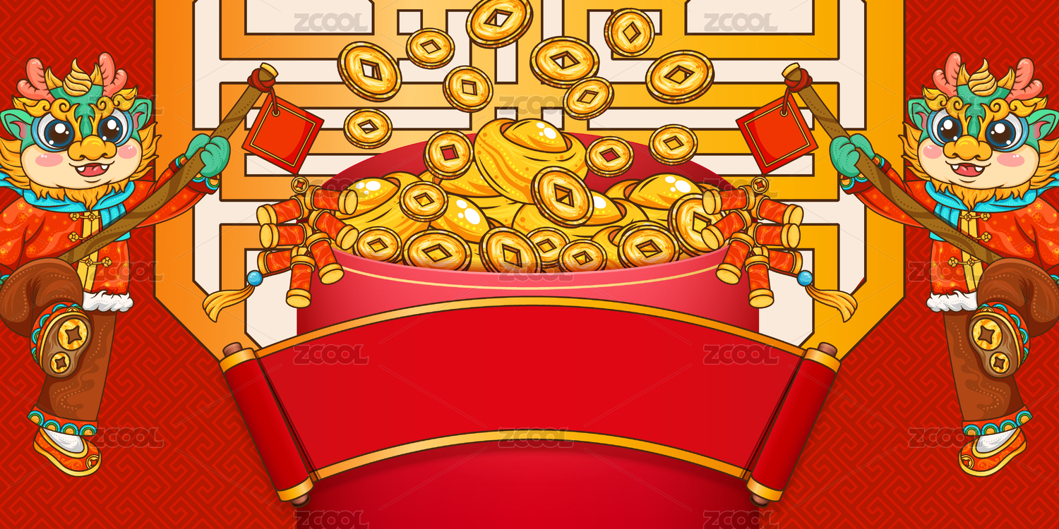 龙年矢量聚宝盆红灯笼吉祥物人偶拜年背景