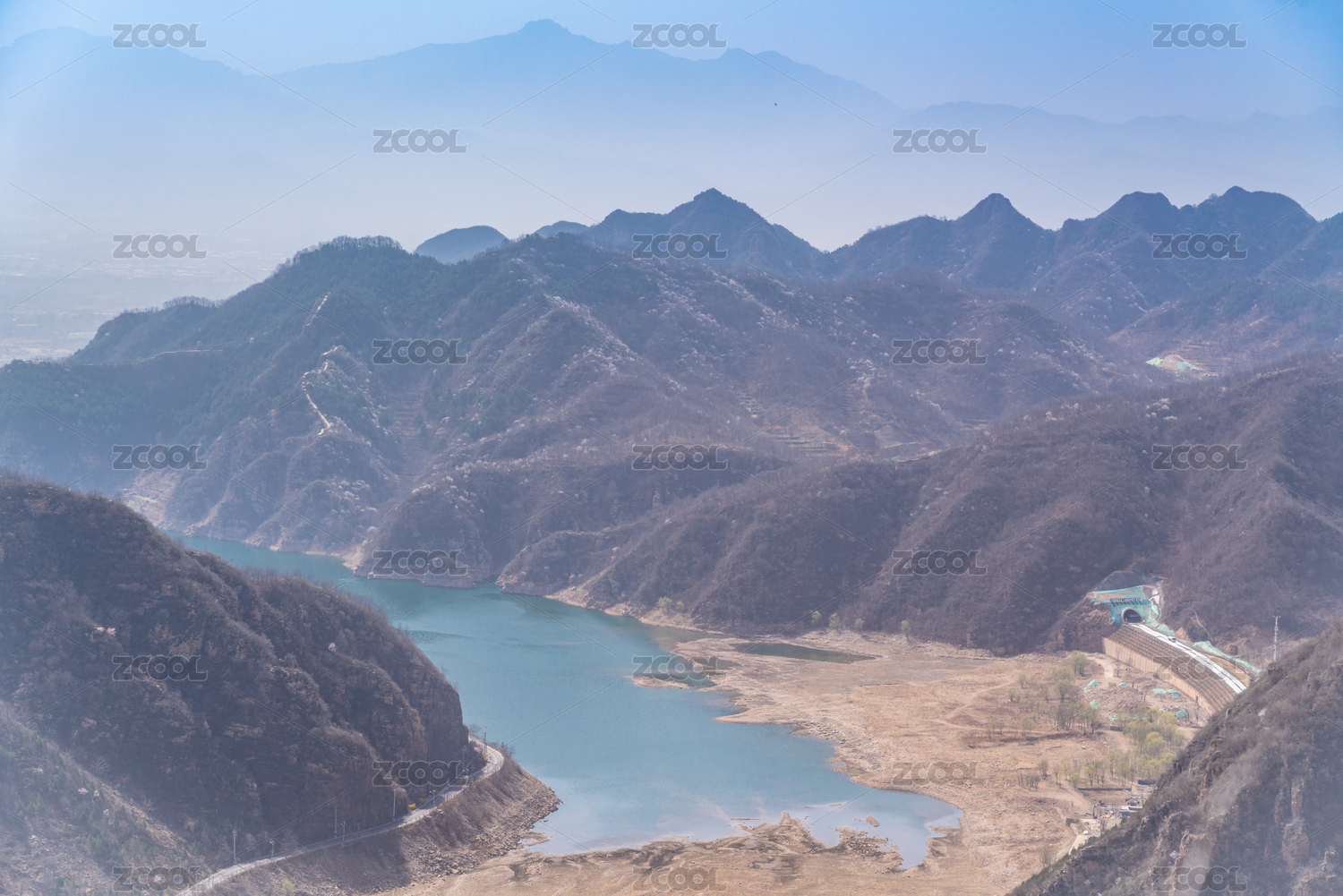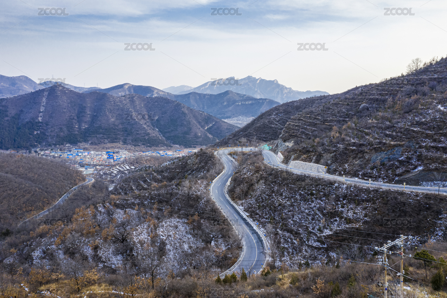 中国北京冬季京西高视角橝柘寺镇山中公路风光
