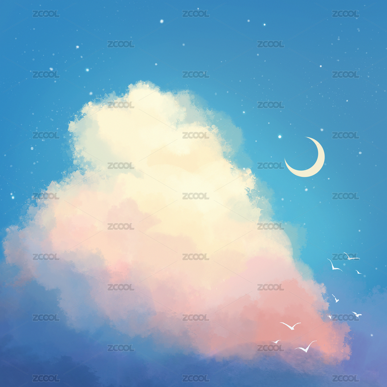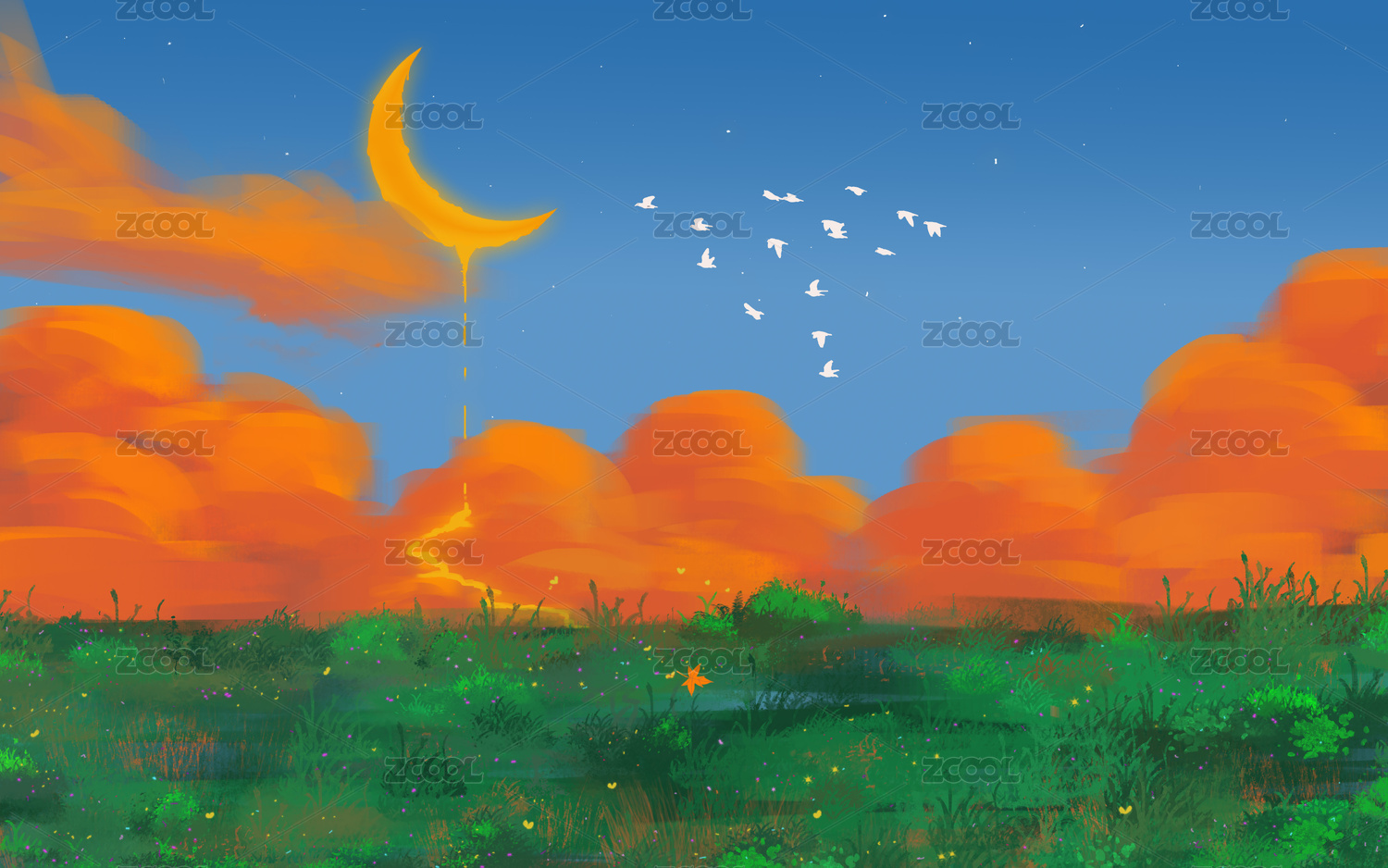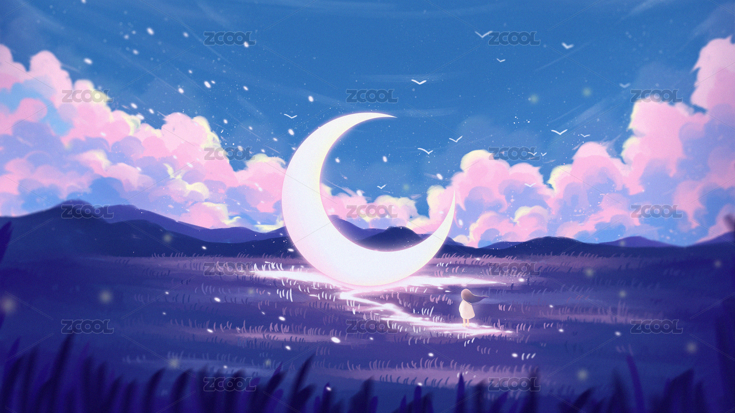 星空下流星、月亮、落满地的星星梦幻插画,浪漫氛围治愈系手绘插画