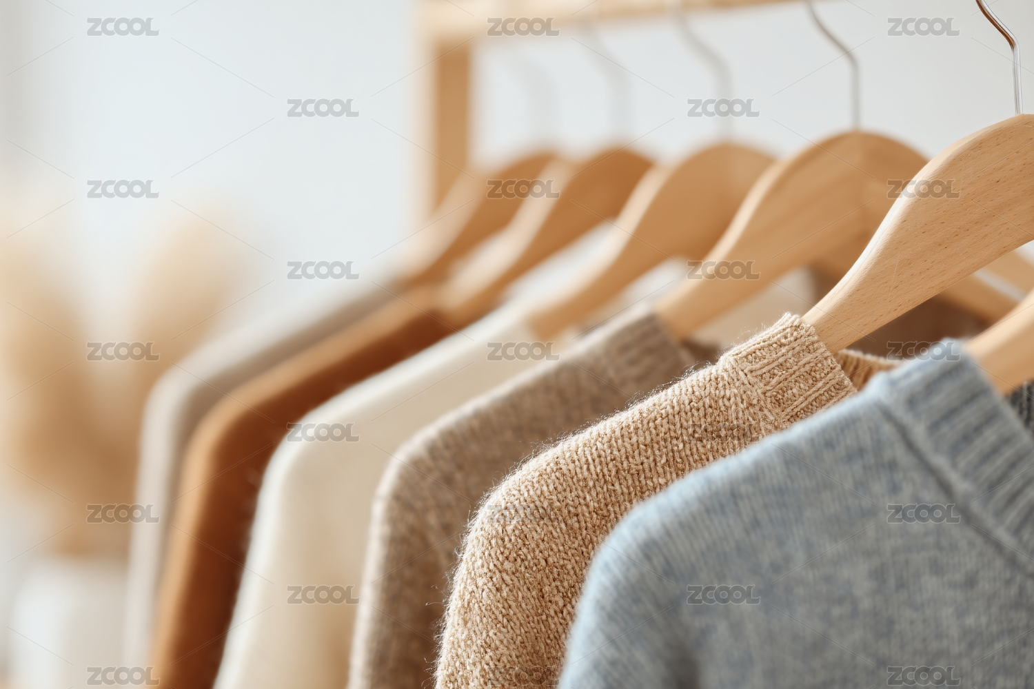 展示多件衣物整齐挂在木制衣架上