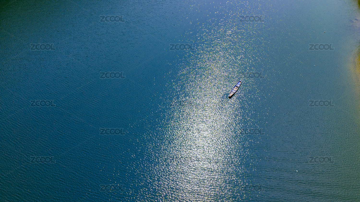 在碧绿的湖水里捕鱼的小渔船和渔夫