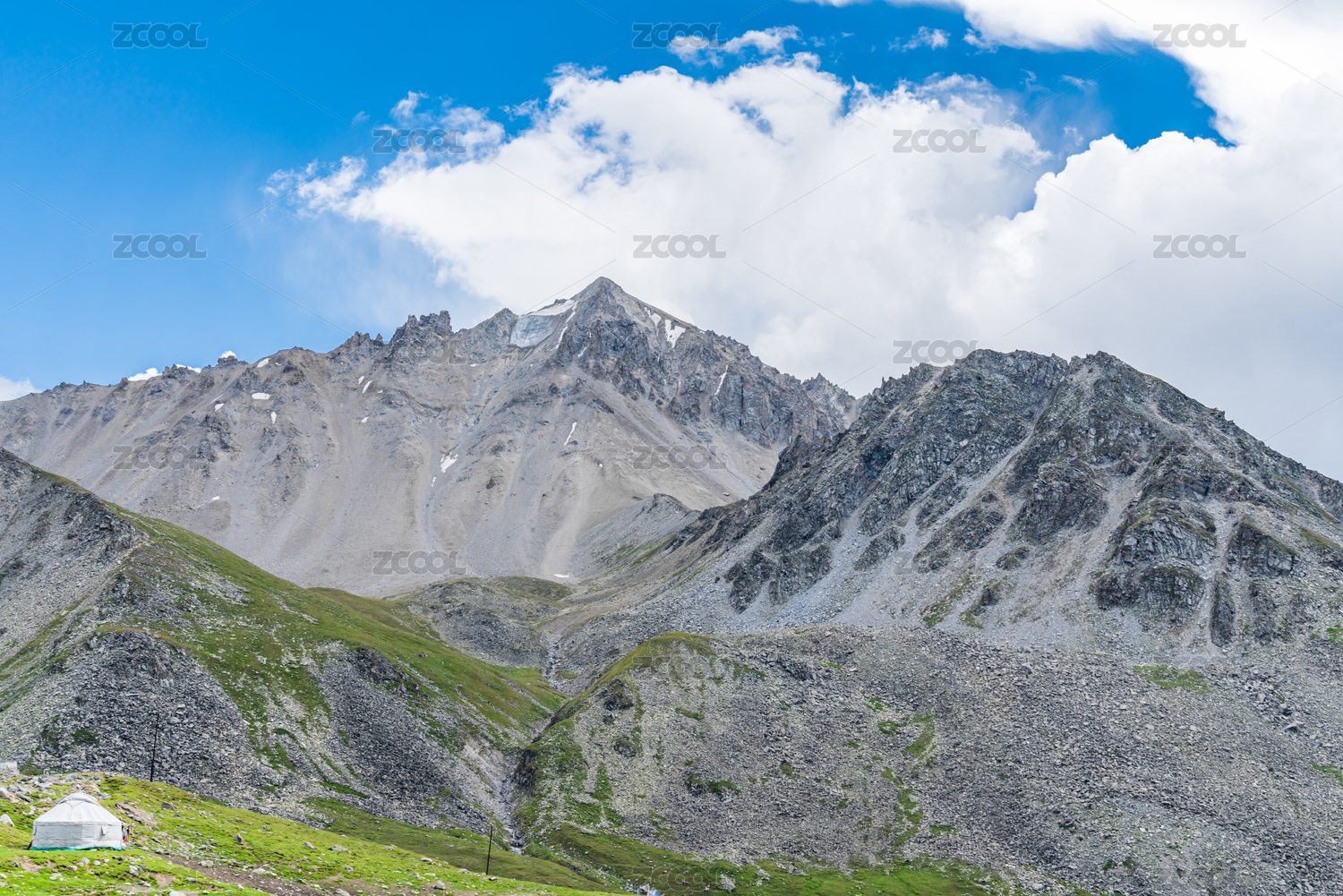 中国新疆夏季蓝天白云下G217独库公路沿途高山戈壁风景