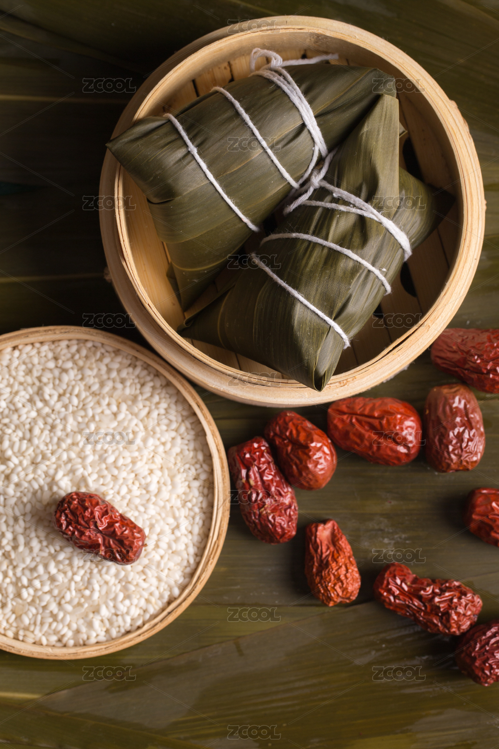 端午粽子及原材料,粽叶上的糯米和红枣。