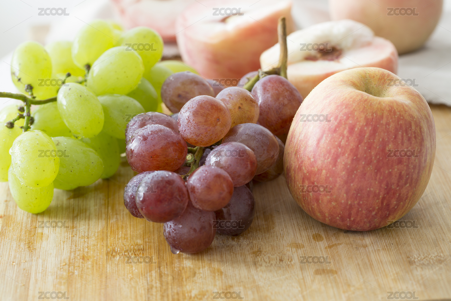 桌子上新鲜的桃子和葡萄,以及苹果,夏季水果
