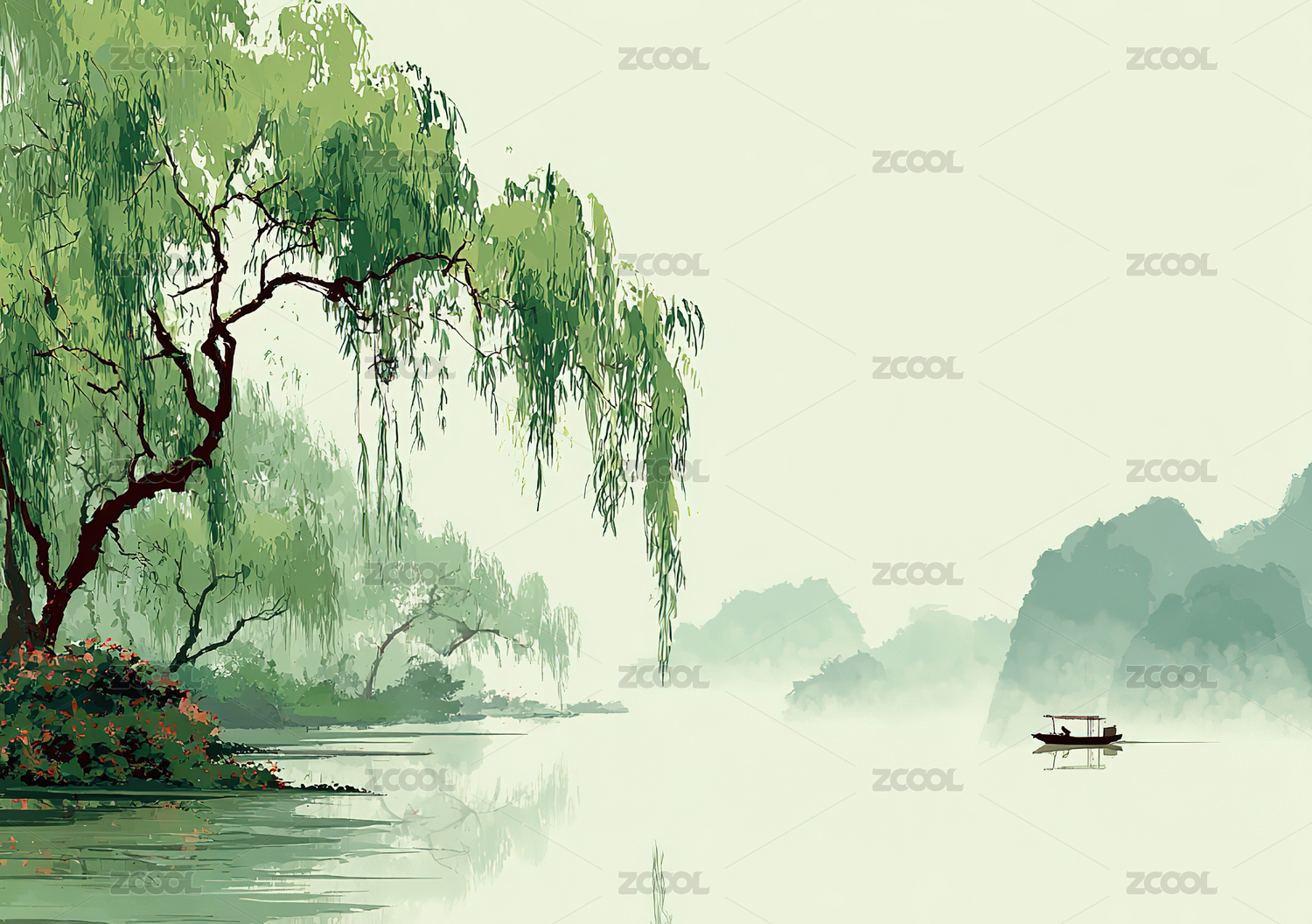 田园,风光,宁静,乡村,柳树,牛,水边,湖面,小船,划船