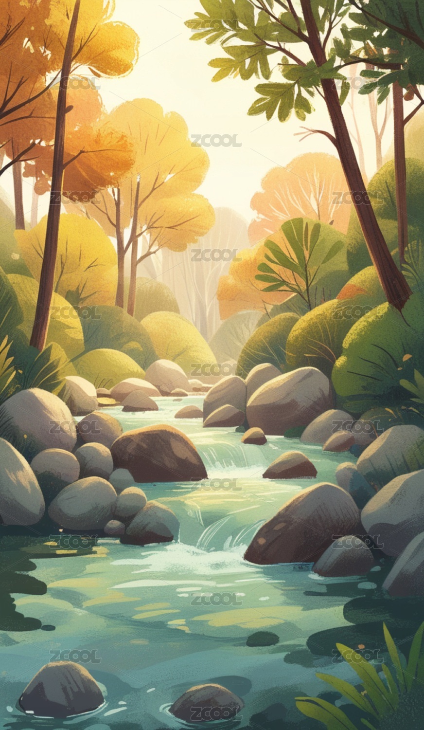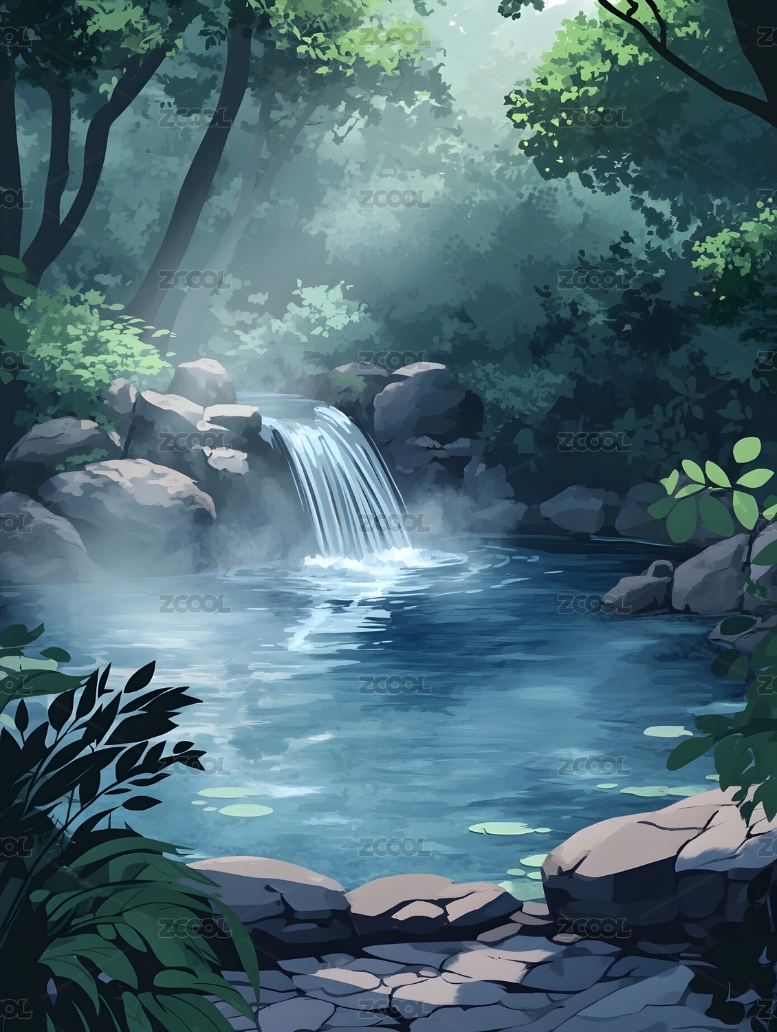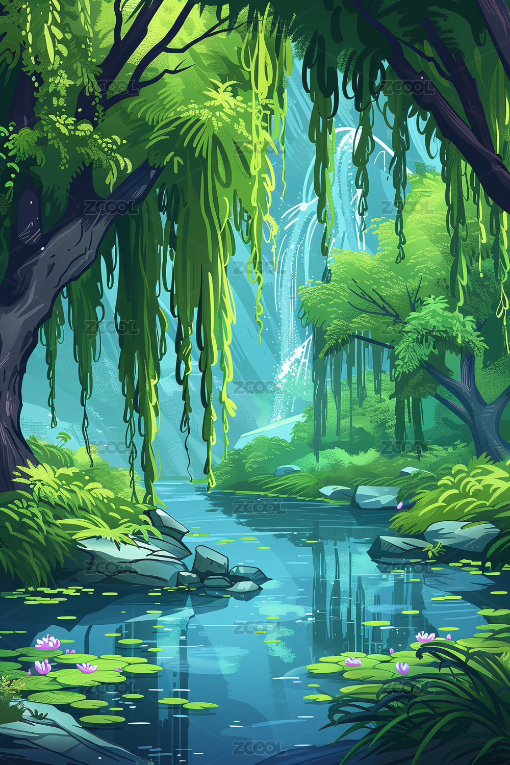 幽静绿色茂密森林中的清澈小溪插画绘画