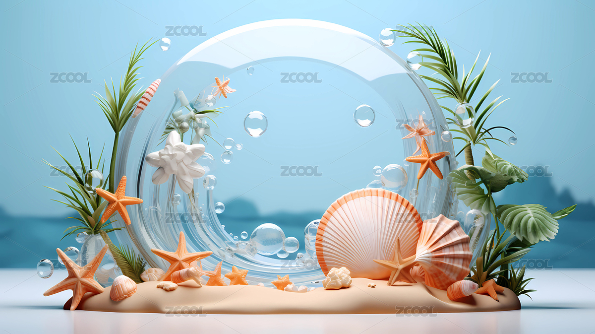 夏日,促销,展台,3D插画,舞台,椰树,椰子树,海边,海滩,游泳圈