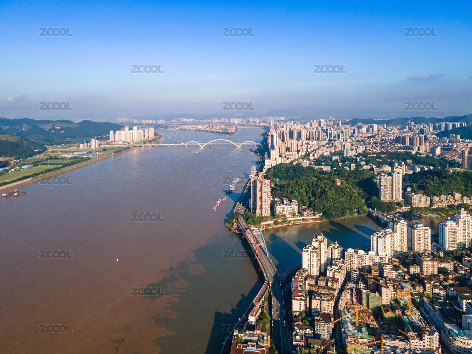 中国广西梧州万秀区城市风光和西江河流航拍