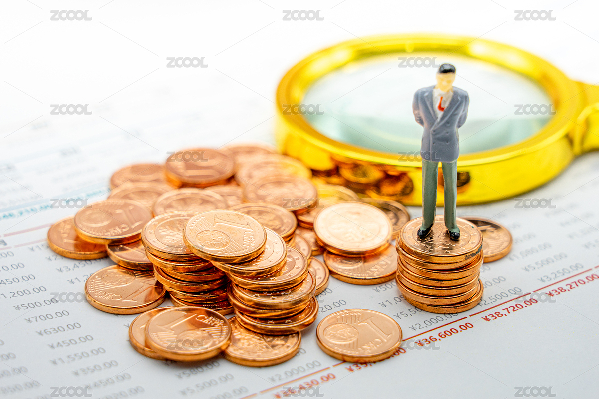 金融文件上的美元硬币和放大镜及一个微缩的小人