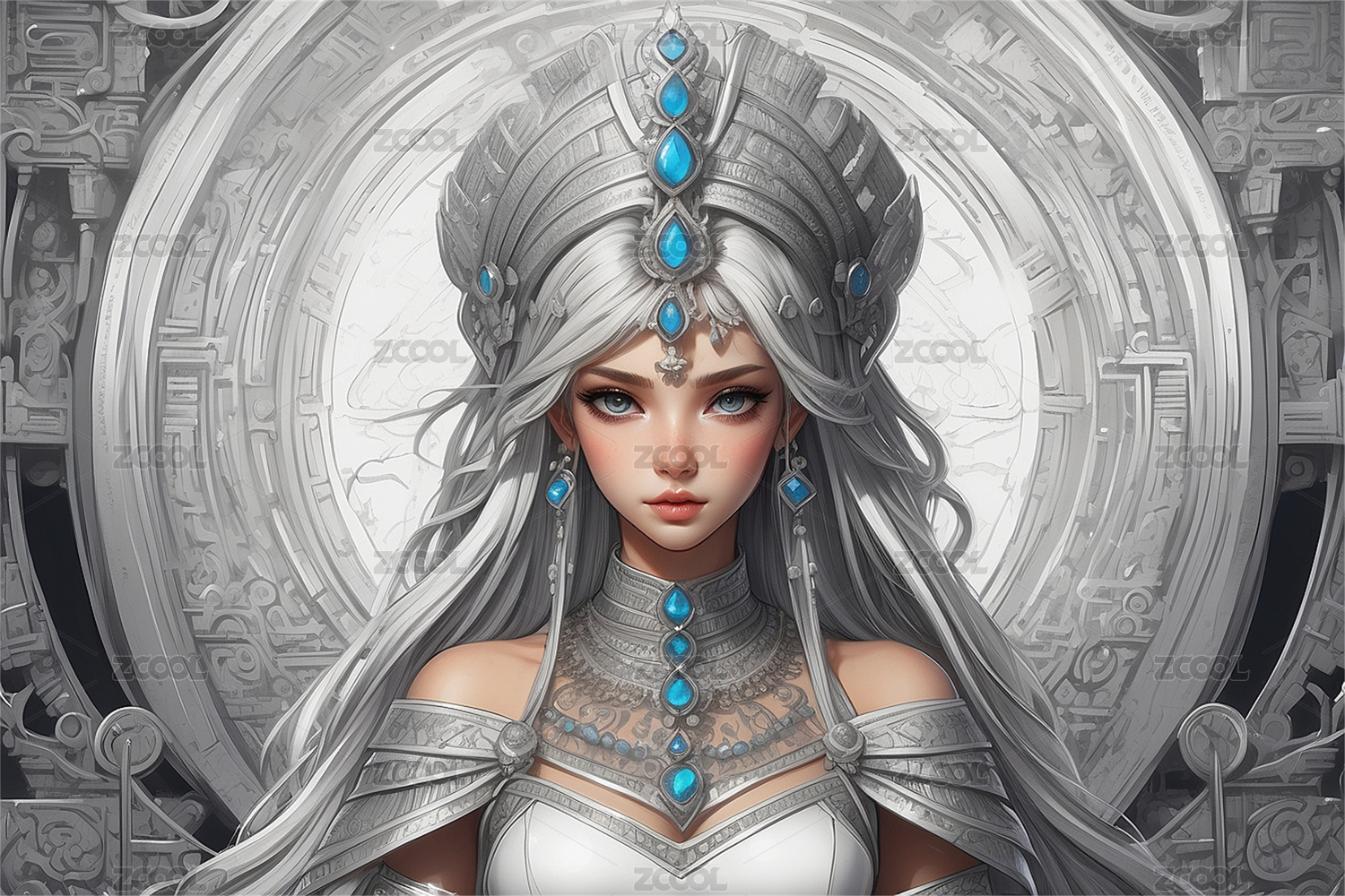神秘银发女王,佩戴蓝宝石皇冠的冷艳美人