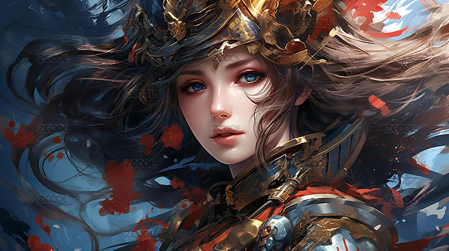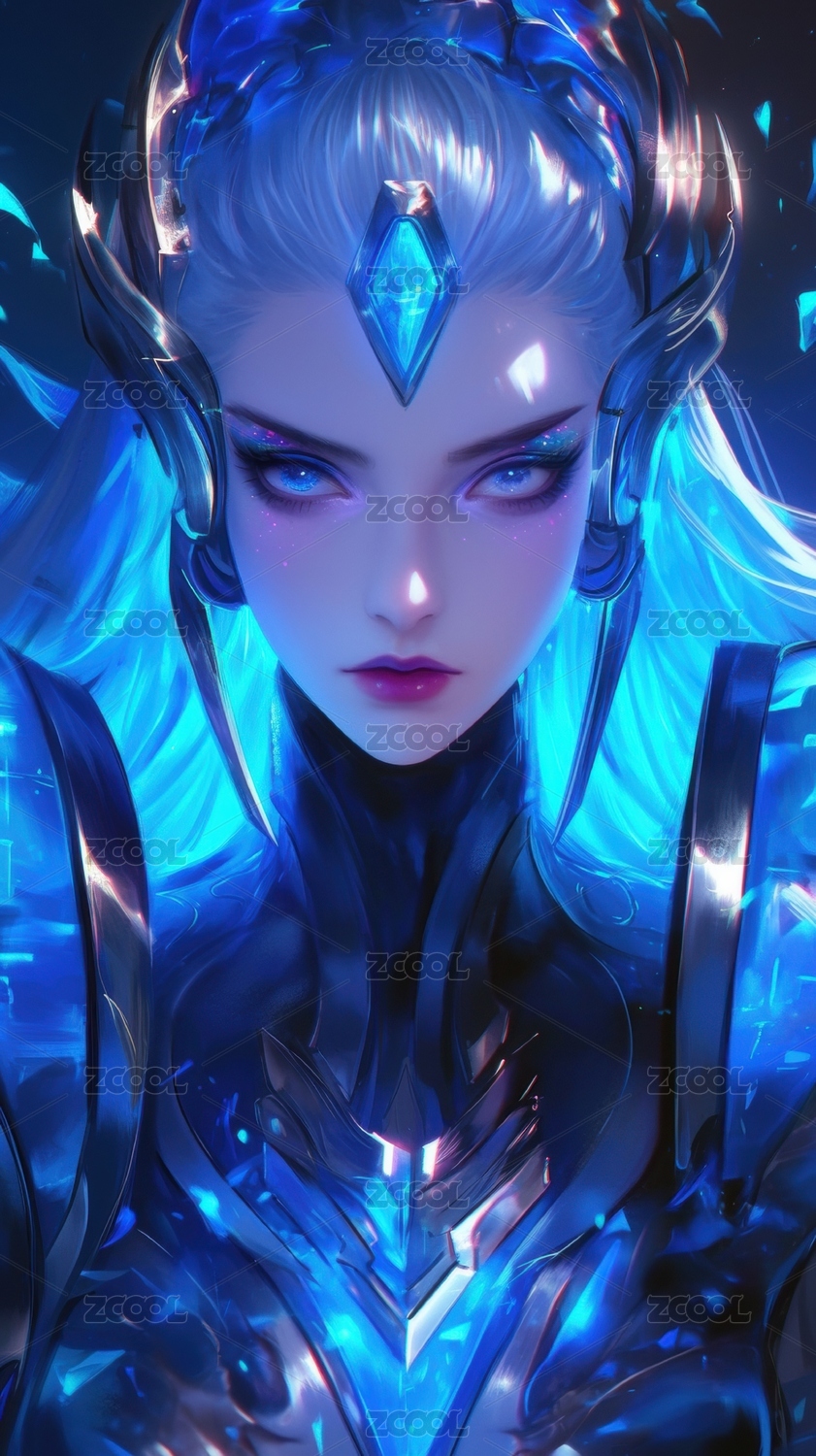 神秘女性角色金色盔甲与蓝色光效