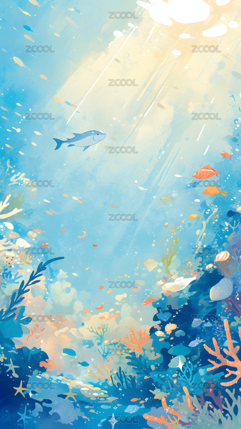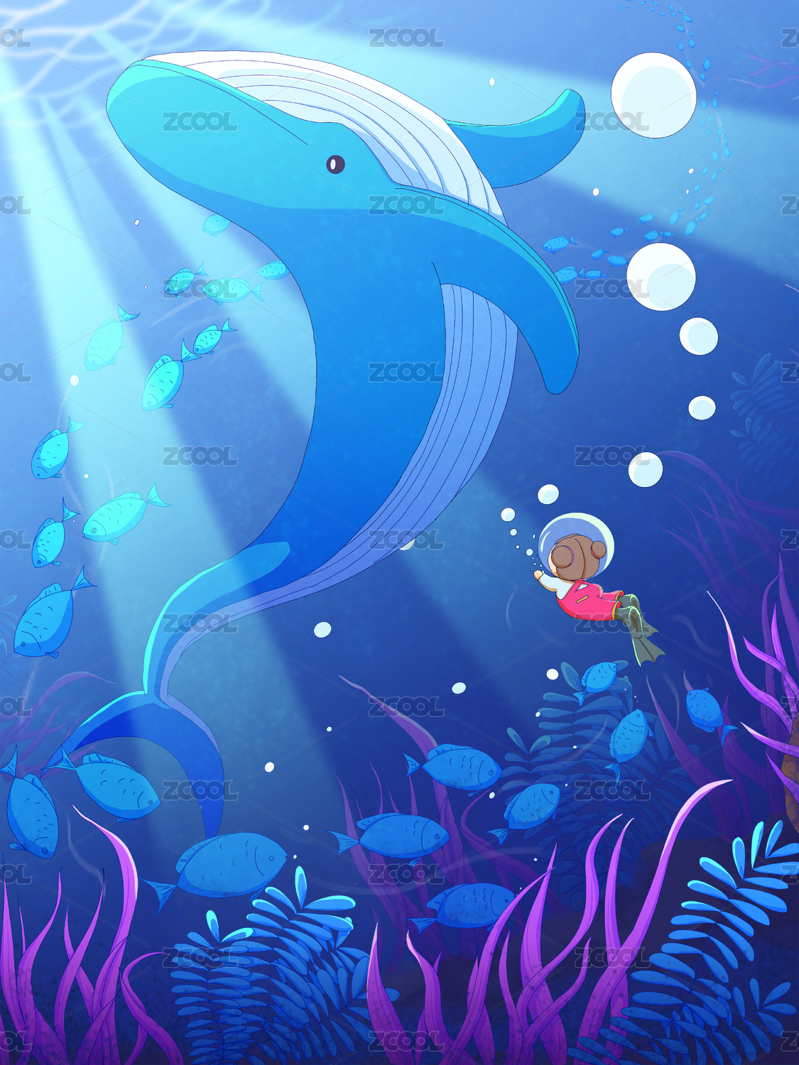 蓝色海洋中小姑娘与鲸鱼共舞海草鱼群环绕