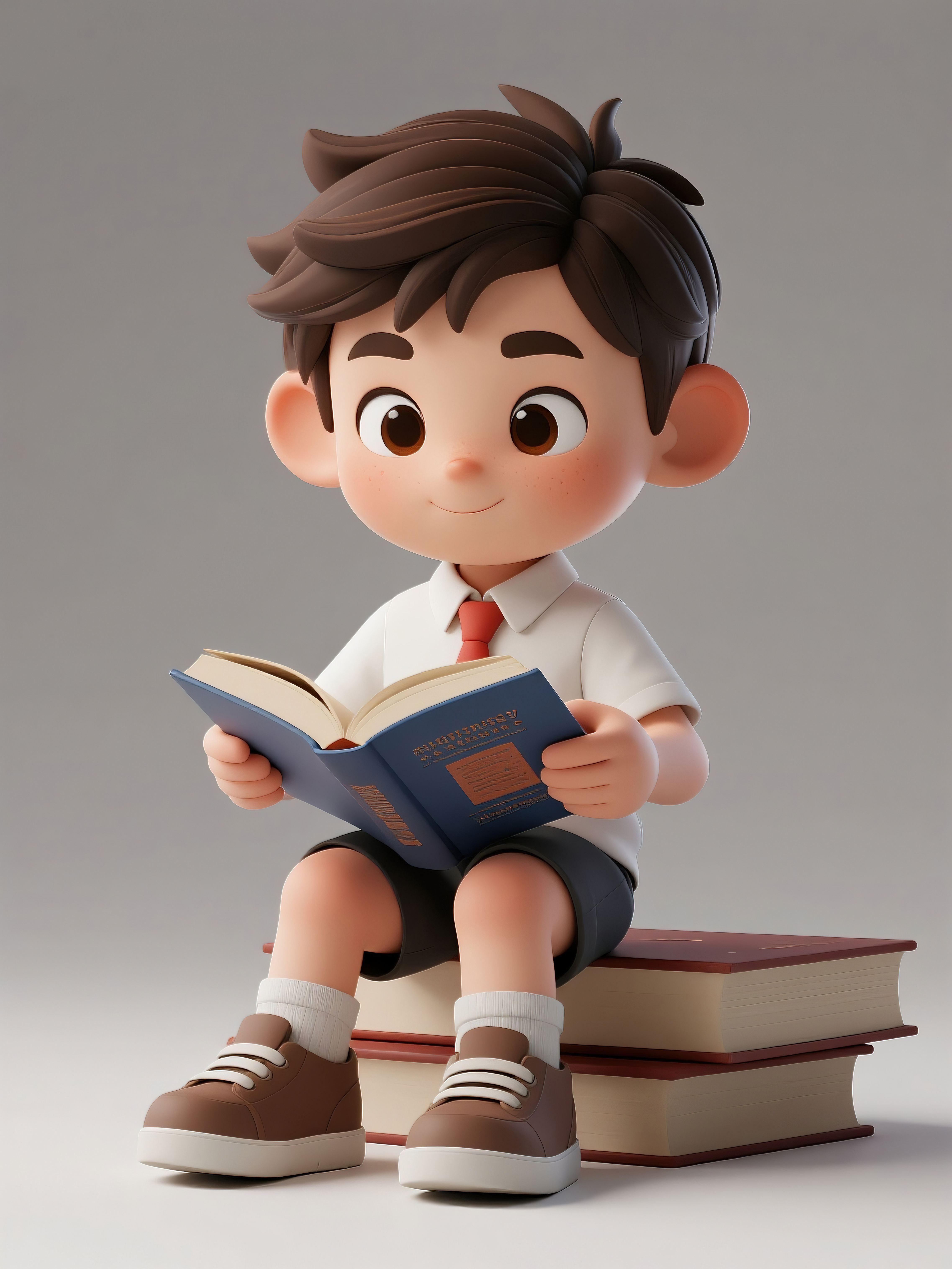 白底3D卡通风格坐在书本上微笑看书的儿童