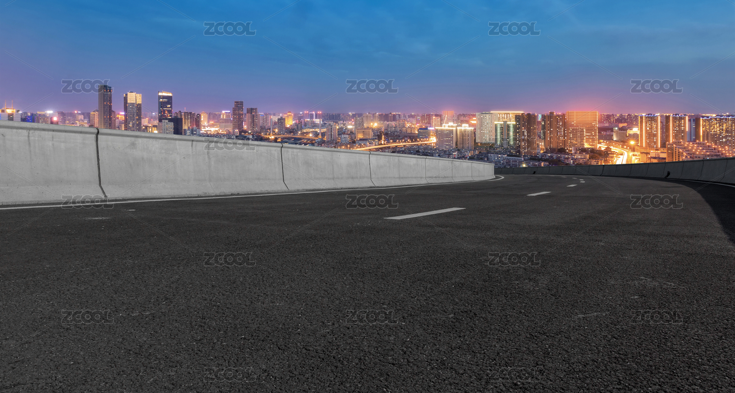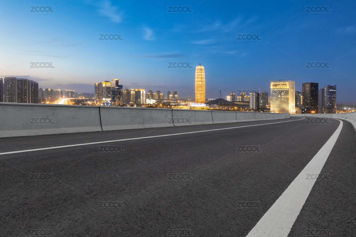黄昏时分,前景为沥青道路的郑州城市景观和城市天际线