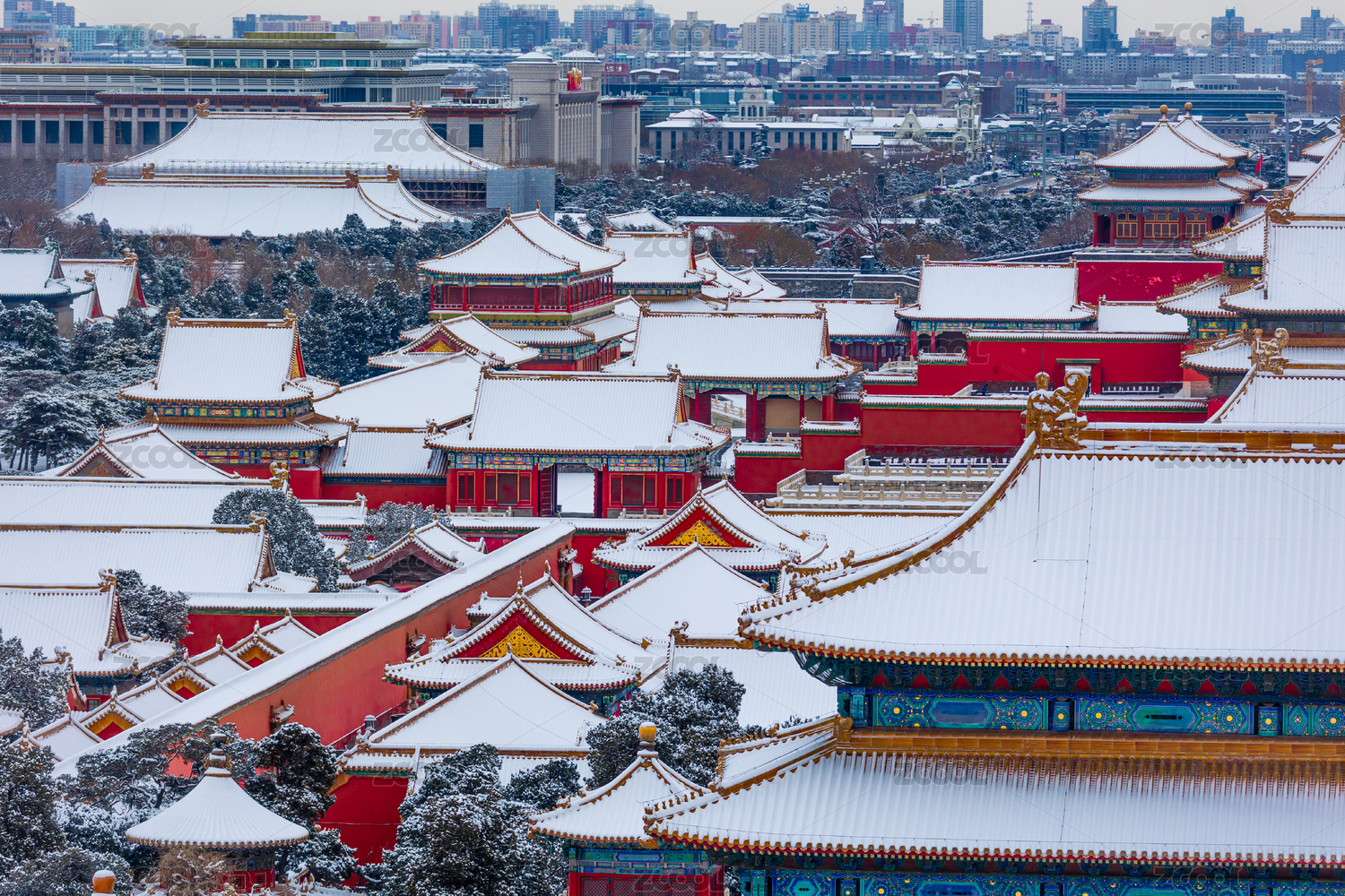中国北京冬季景山公园视角俯瞰故宫雪后建筑风光