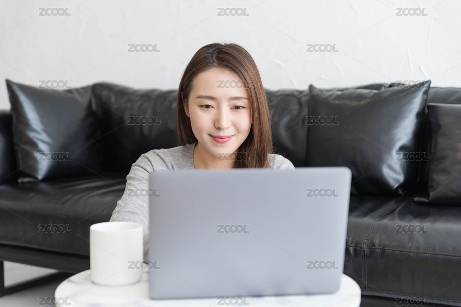 一个年轻女性在客厅微笑操作电脑使用电脑工作