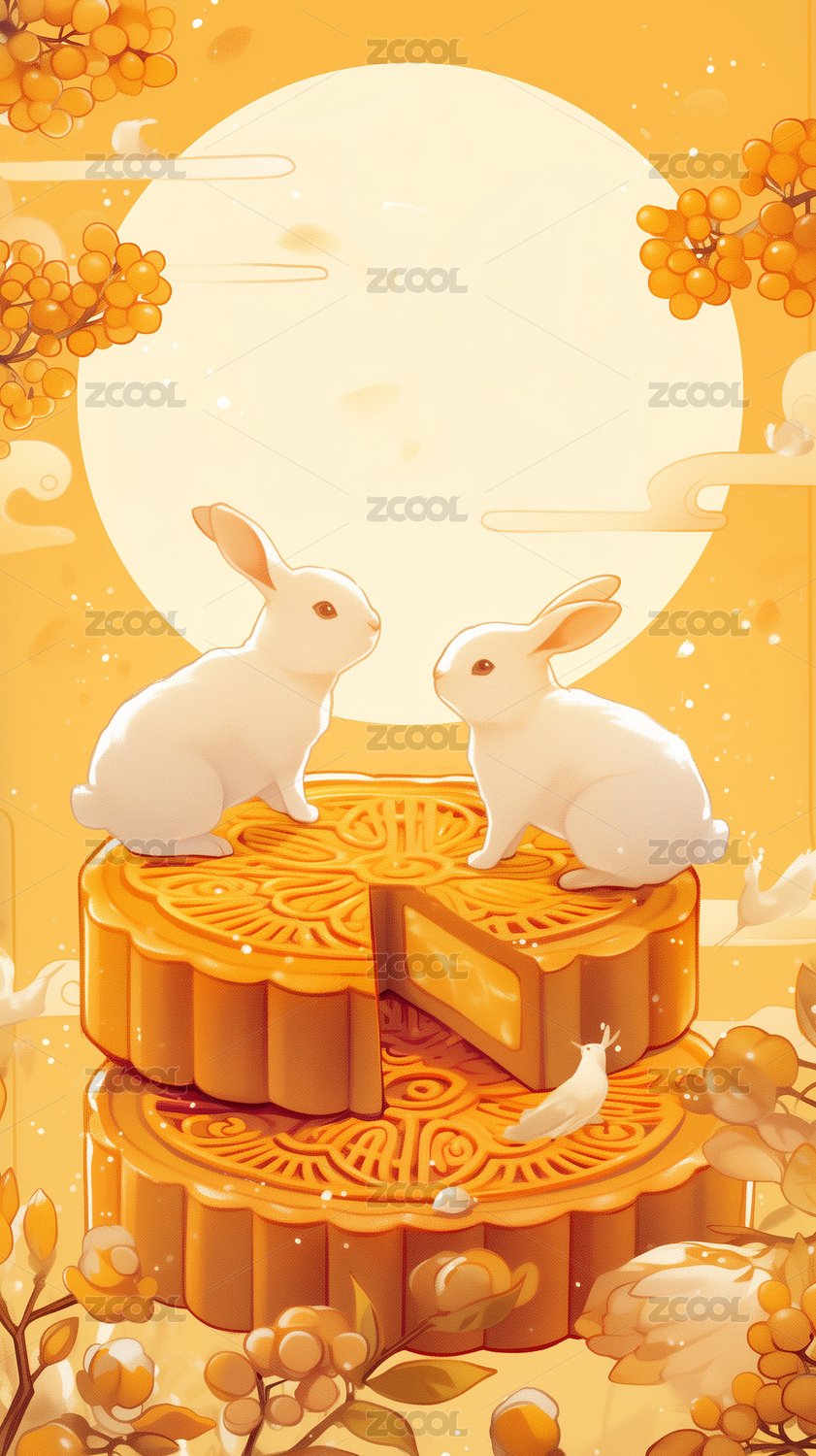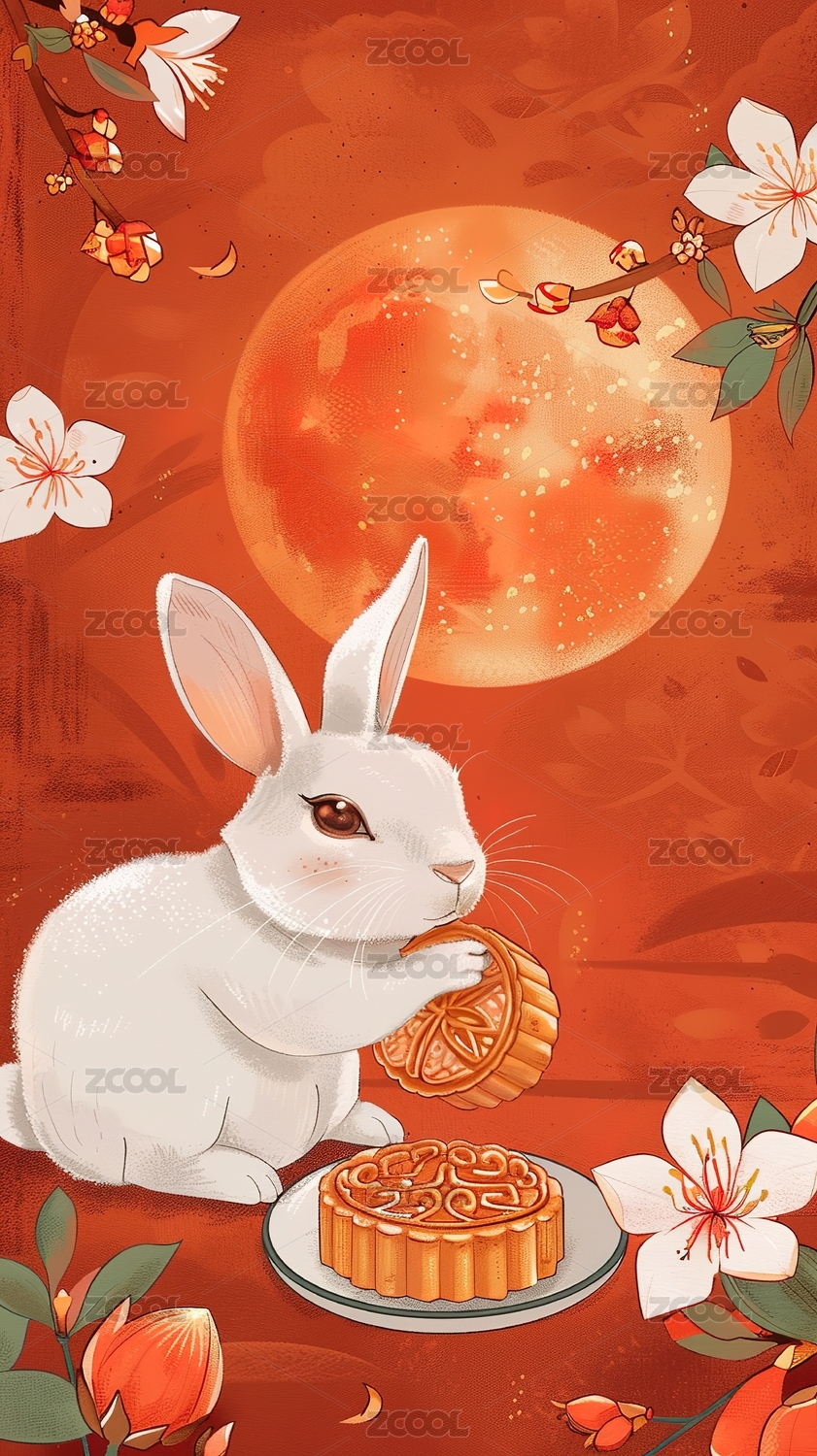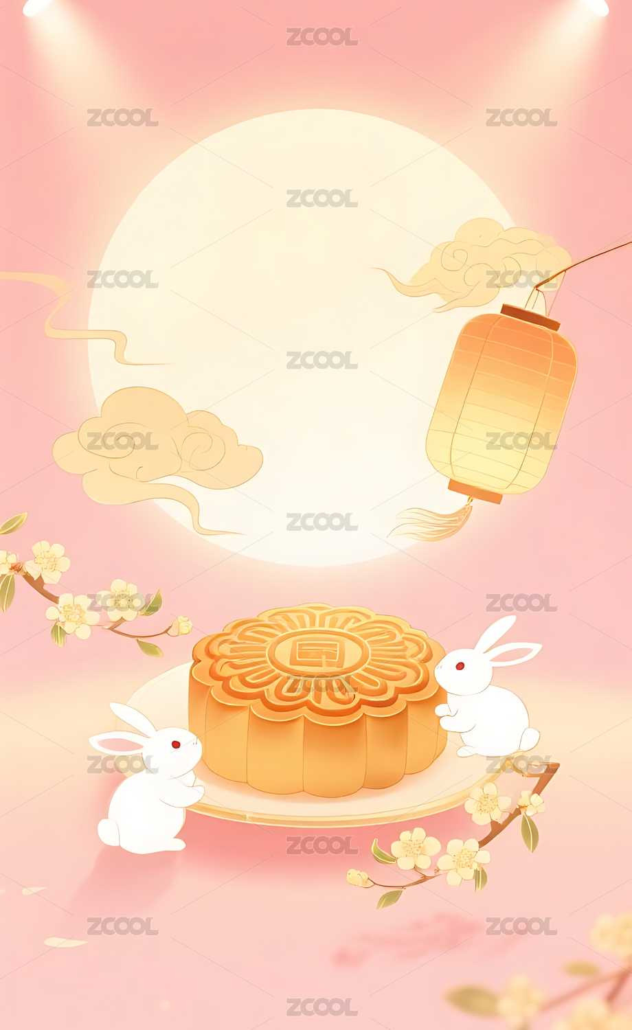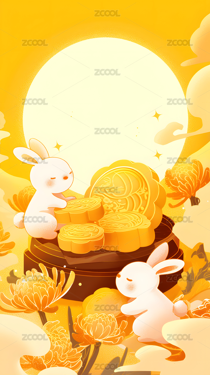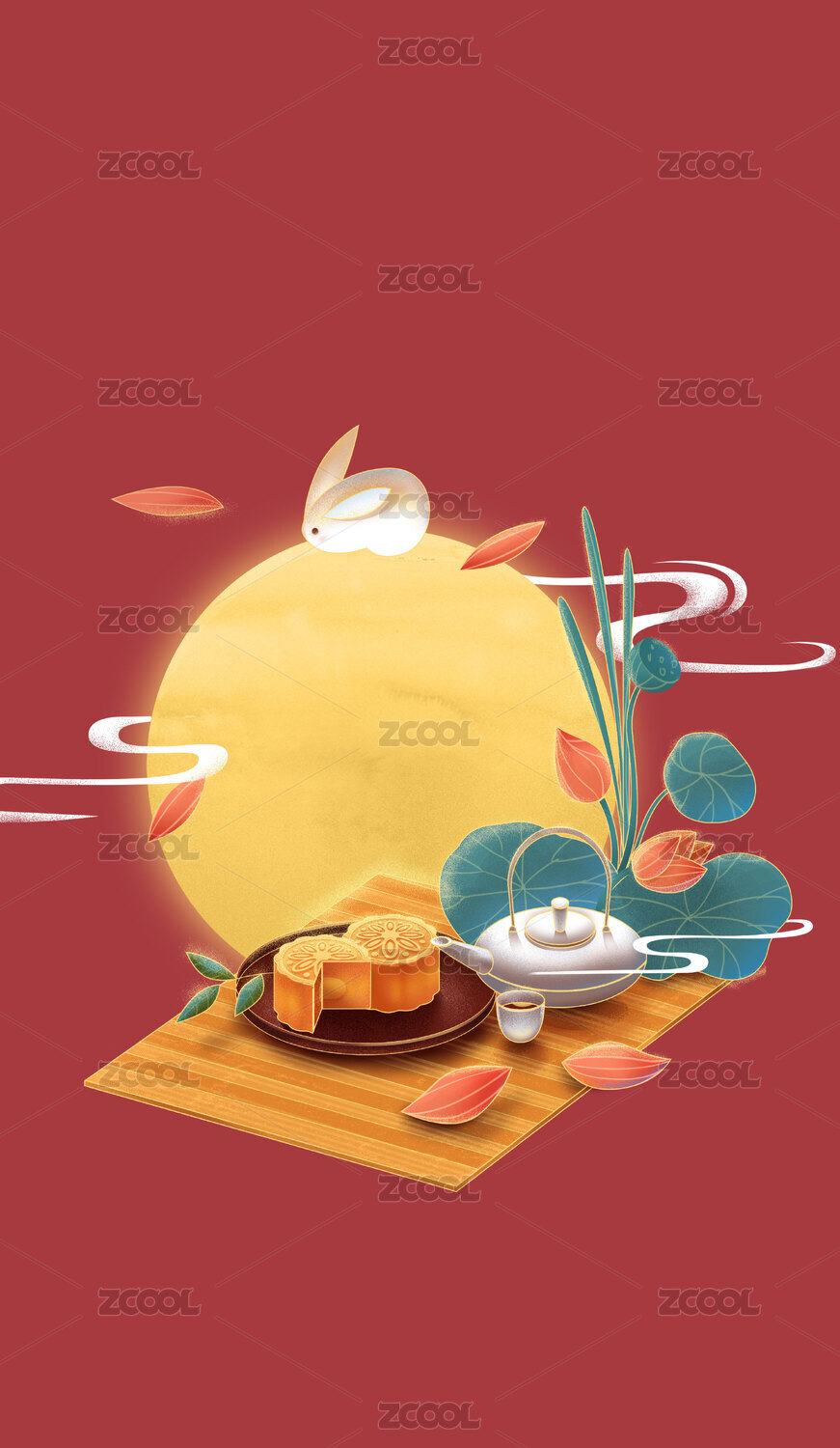 中秋赏月云纹玉兔月饼荷花横竖版插画