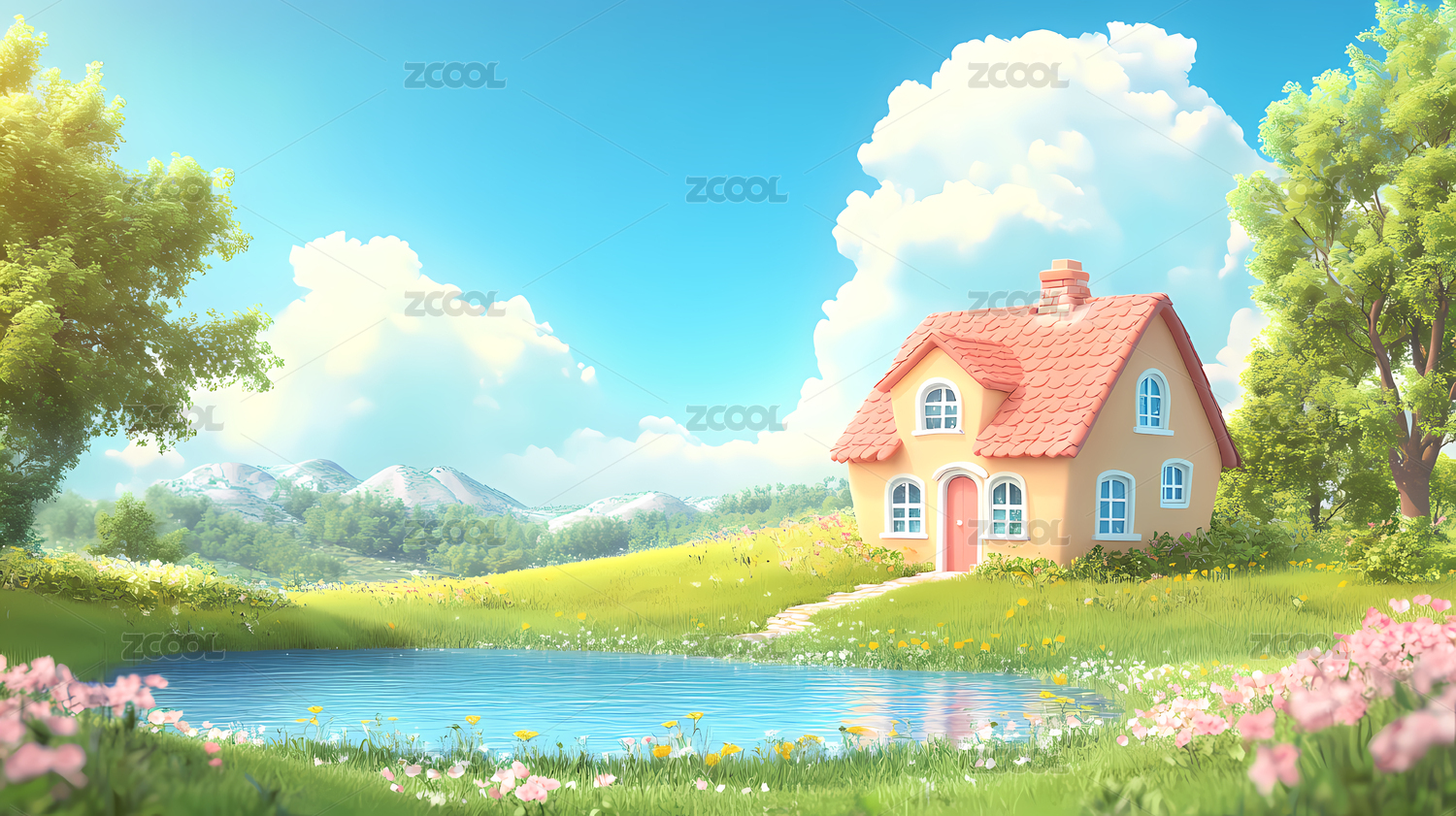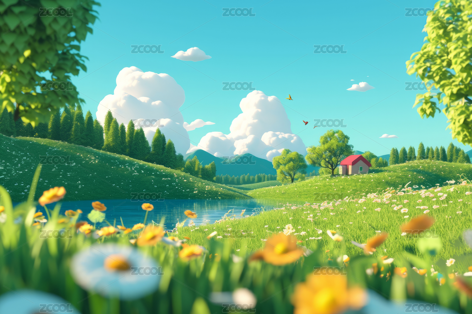 3D卡通春天草地可爱粉色花朵三维自然背景