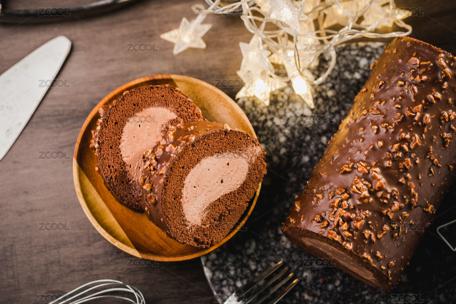 蛋糕卷,蛋黄卷,巧克力卷,坚果碎,巧克力酱,砧板,切开,木盘,点心,乳品