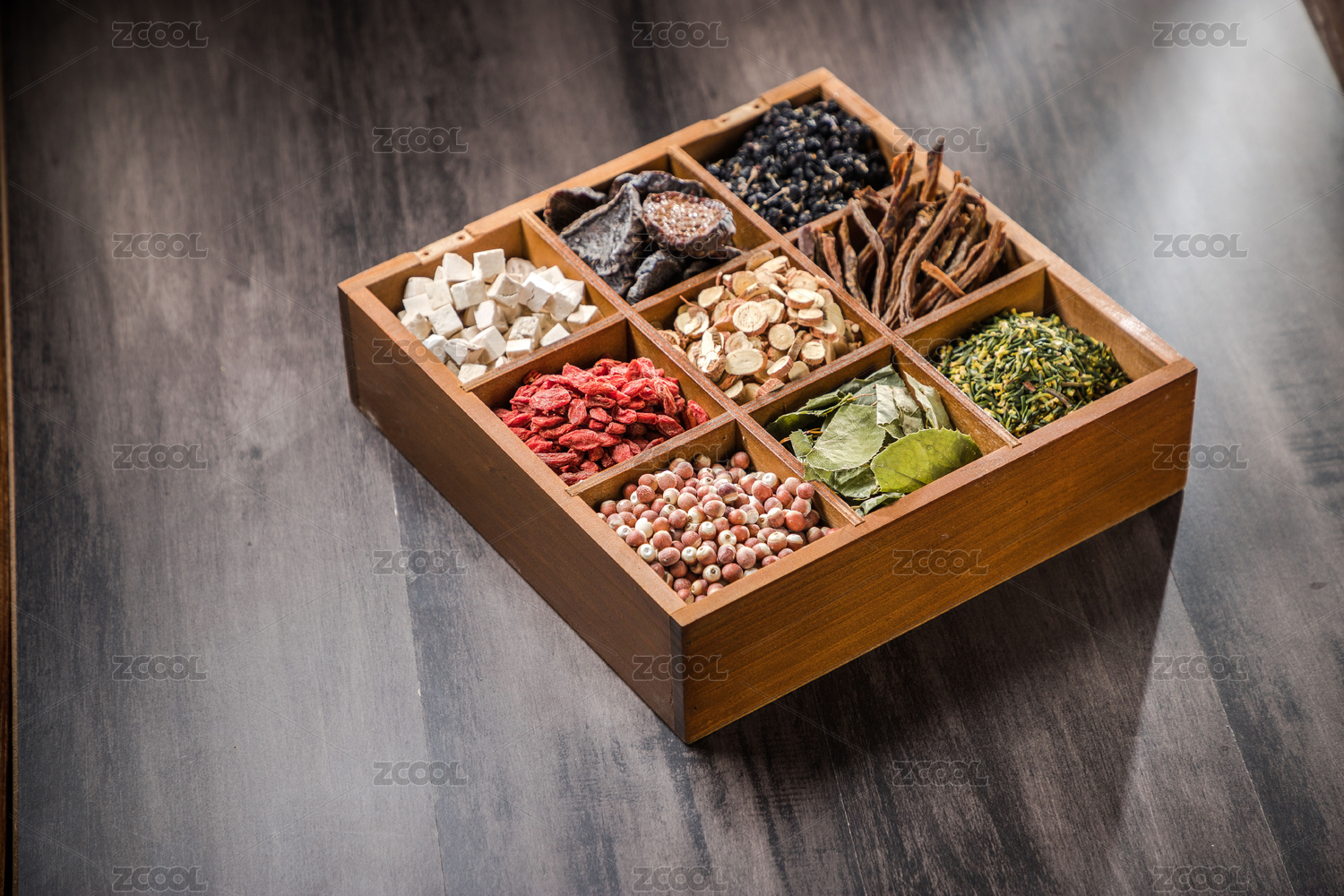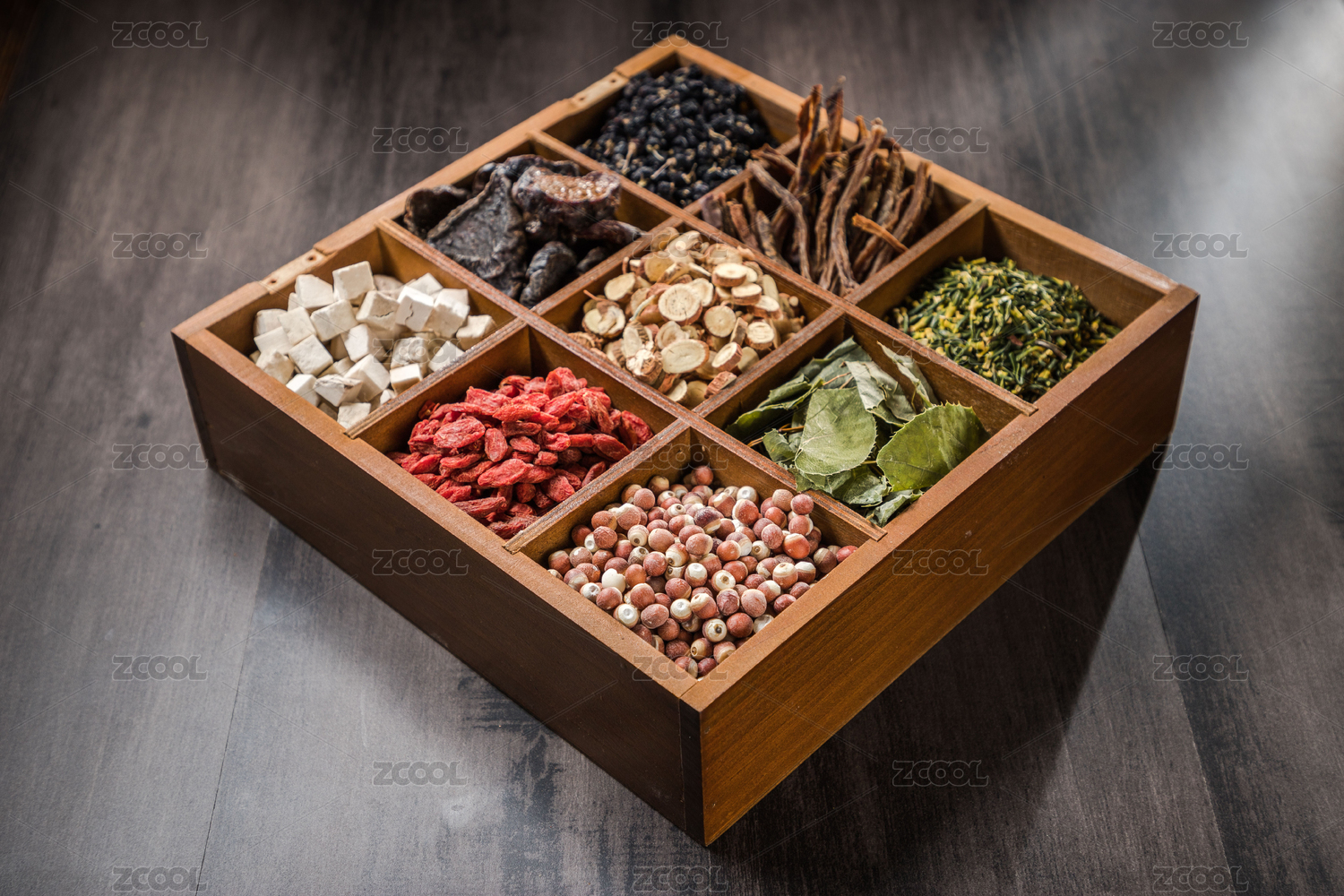 一束光打在装满中药材的药匣子上