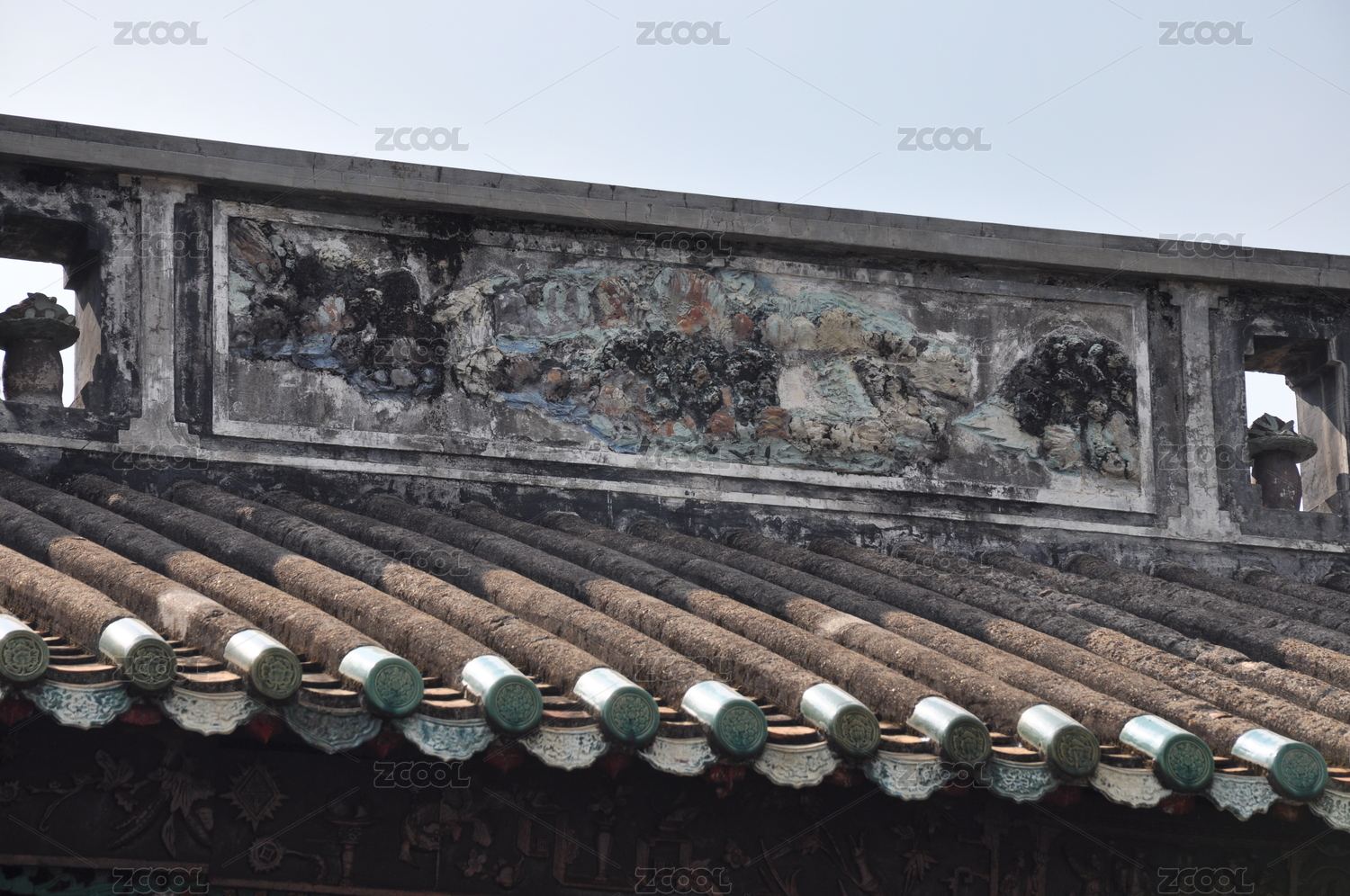 岭南传统民居建筑墙上雕刻着彩色的石刻