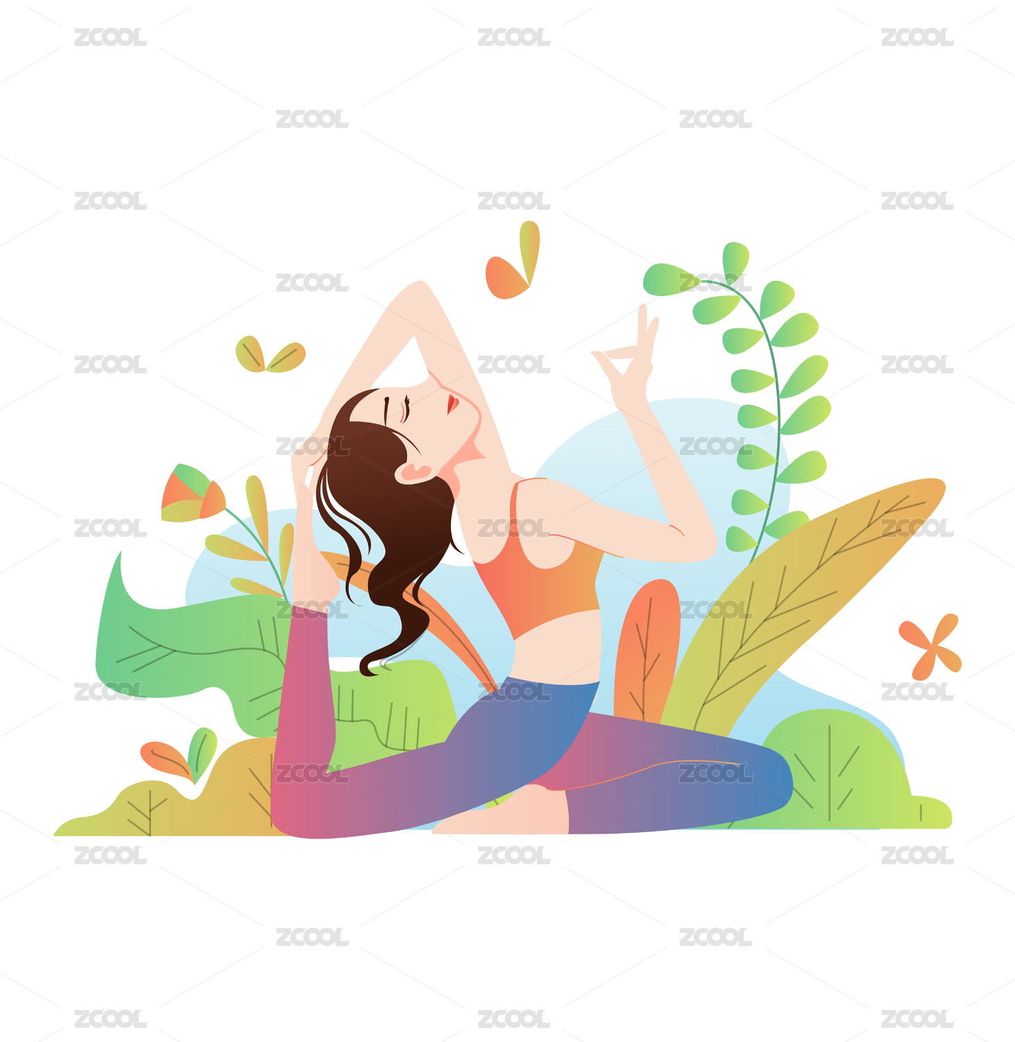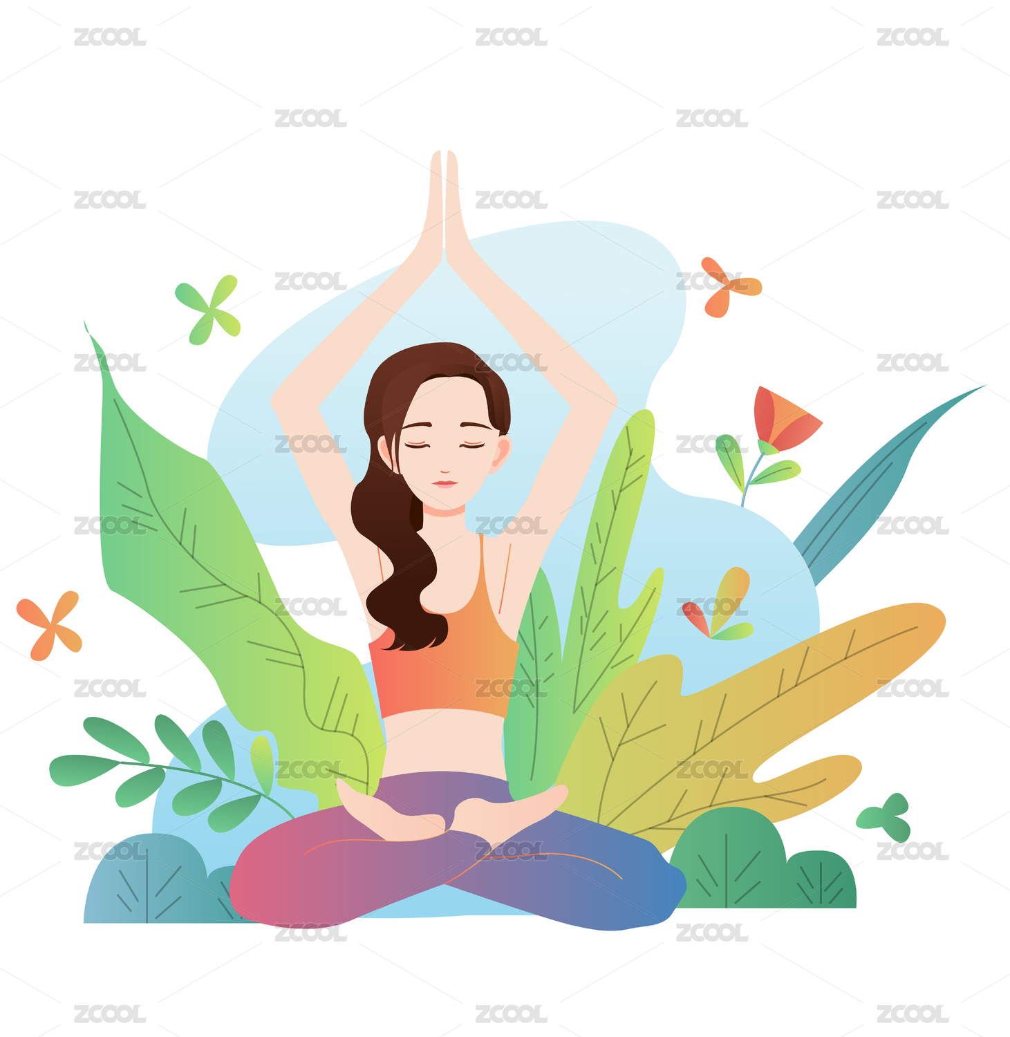 一位女性在花卉背景前做瑜伽运动的矢量插画