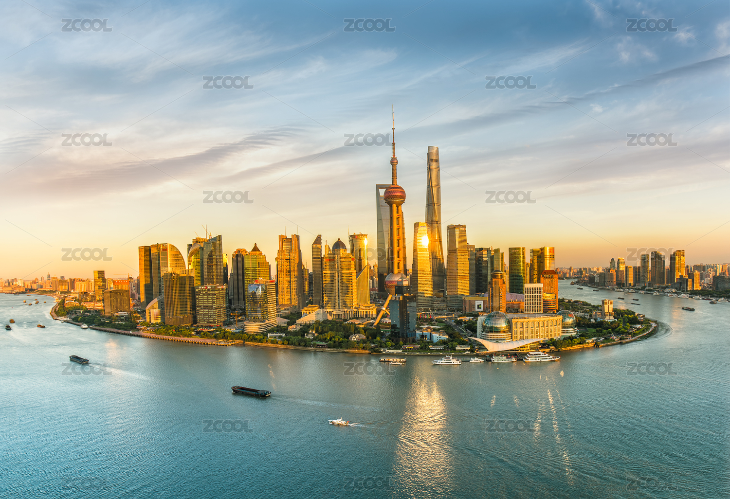 上海高楼俯瞰陆家嘴黄浦江东方明珠日出全景