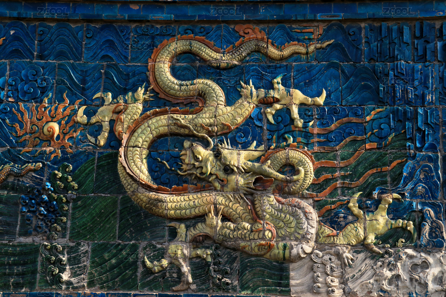 北京市北海公园清代建筑九龙壁上的龙形雕像