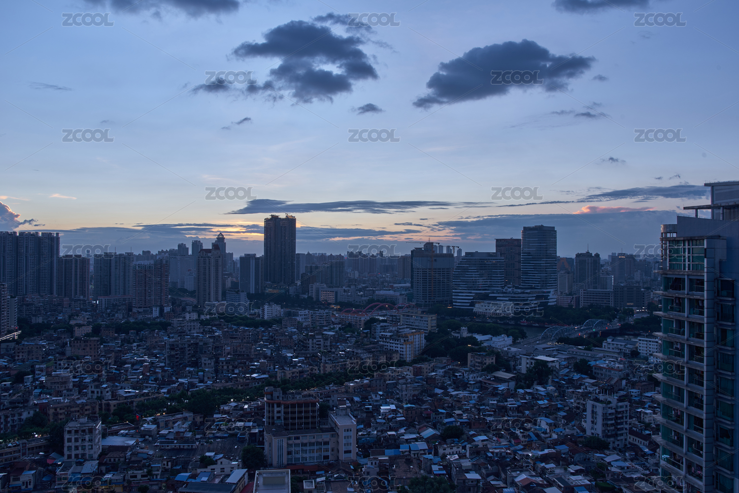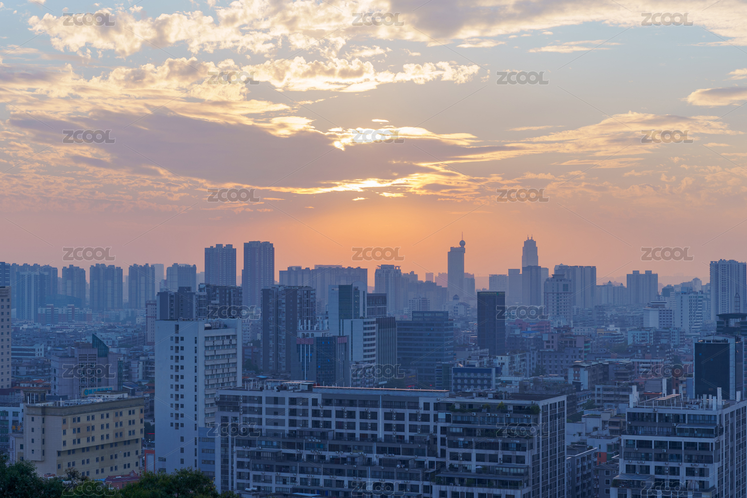 广州城市高楼建筑群与日出朝霞云彩全景风光