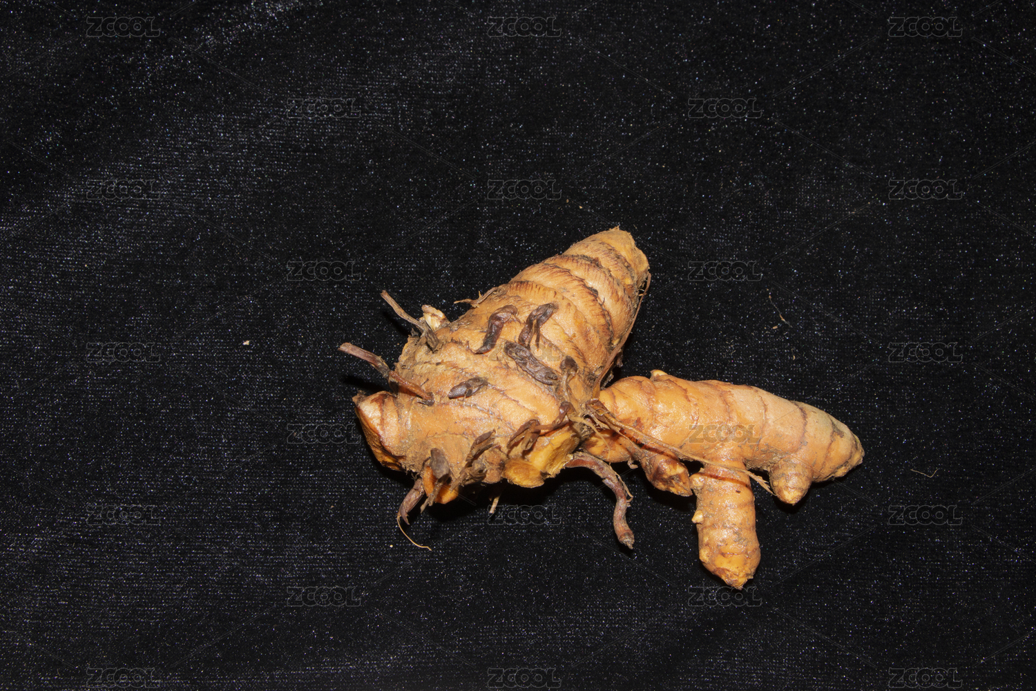 黑色背景下发芽的小黄姜(姜黄)