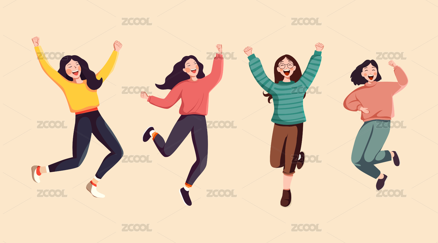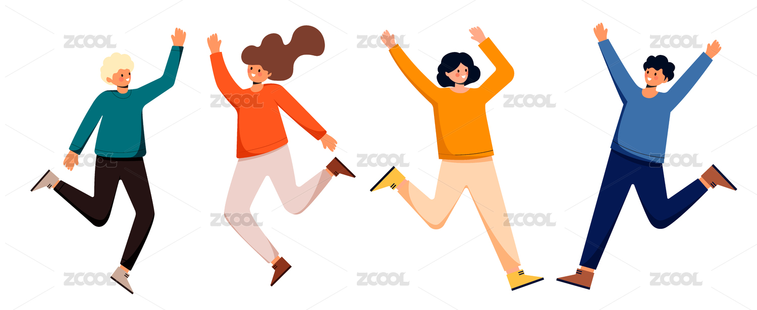四个跳起来的青年男女插画素材