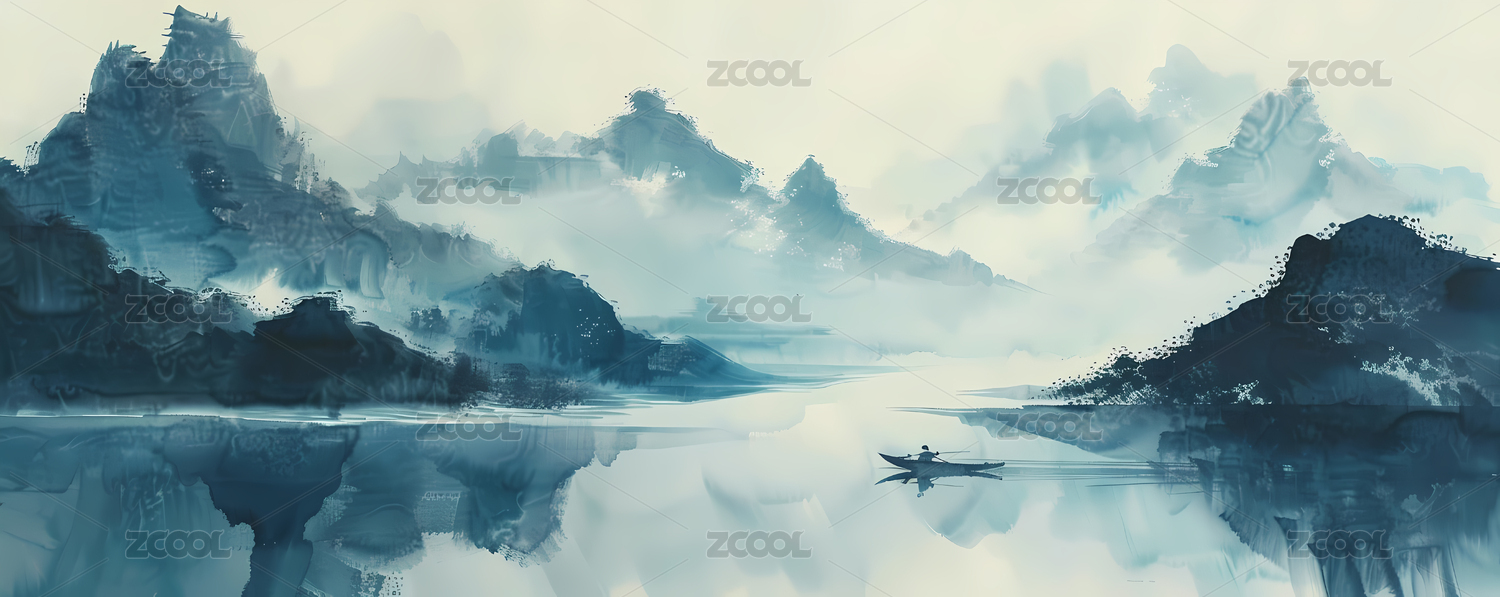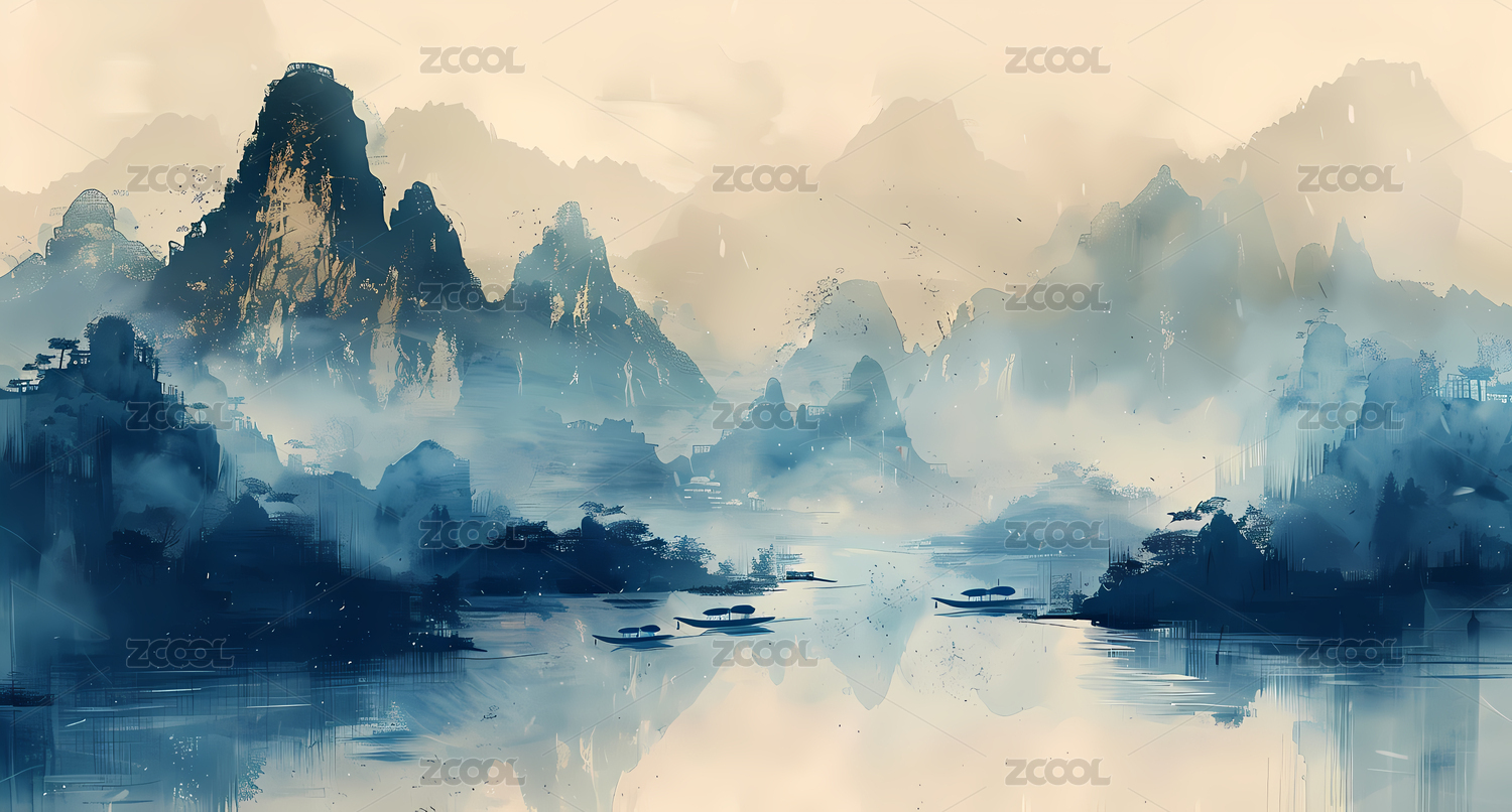 蓝色调的水墨风山水画,水墨风意境山水画概
