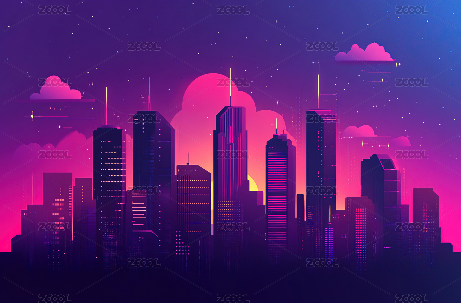 紫色夜空下的城市天际线