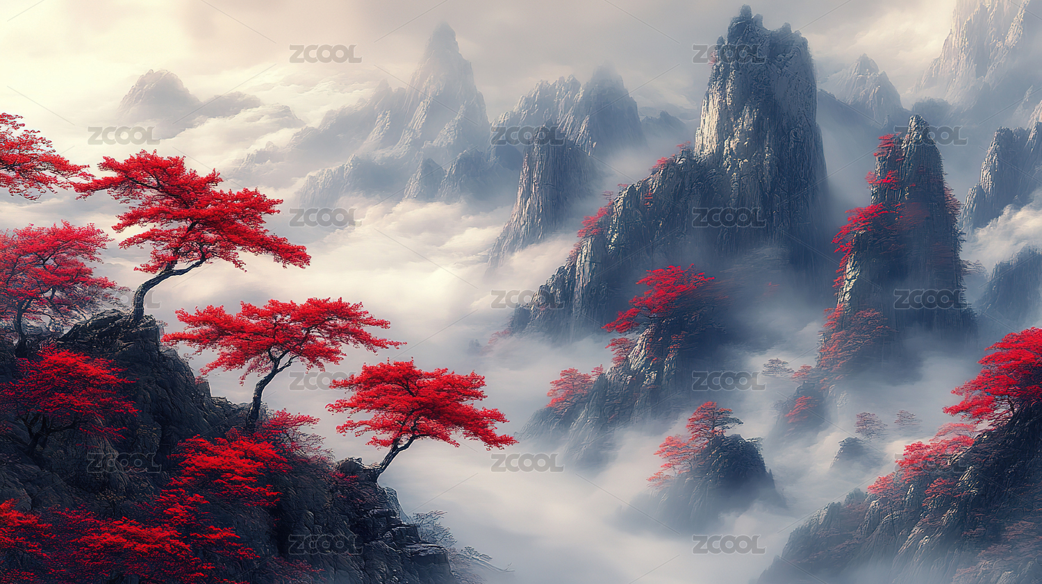 户外,插画,风景,自然,树,中国画,高山,季节,传统