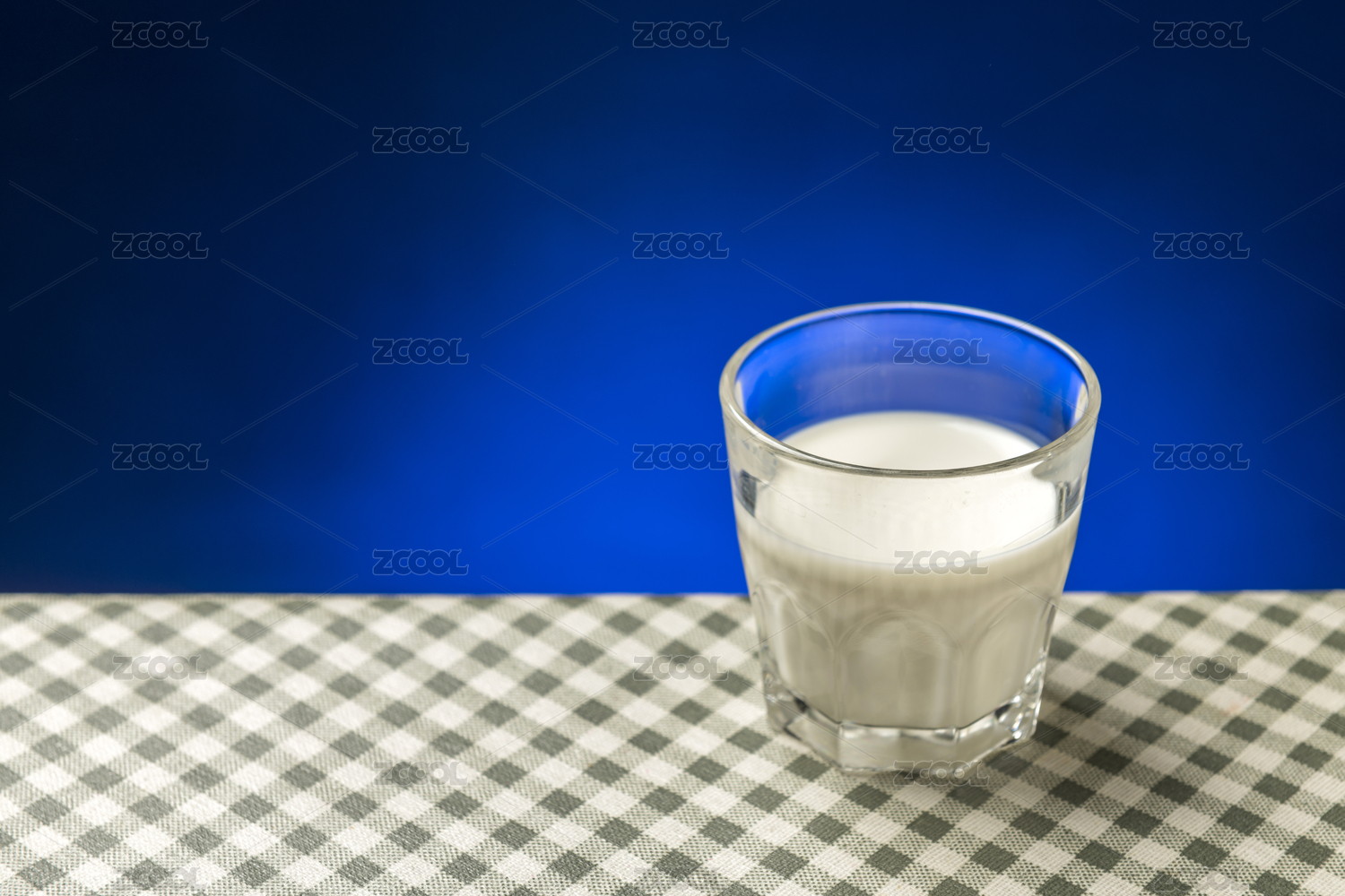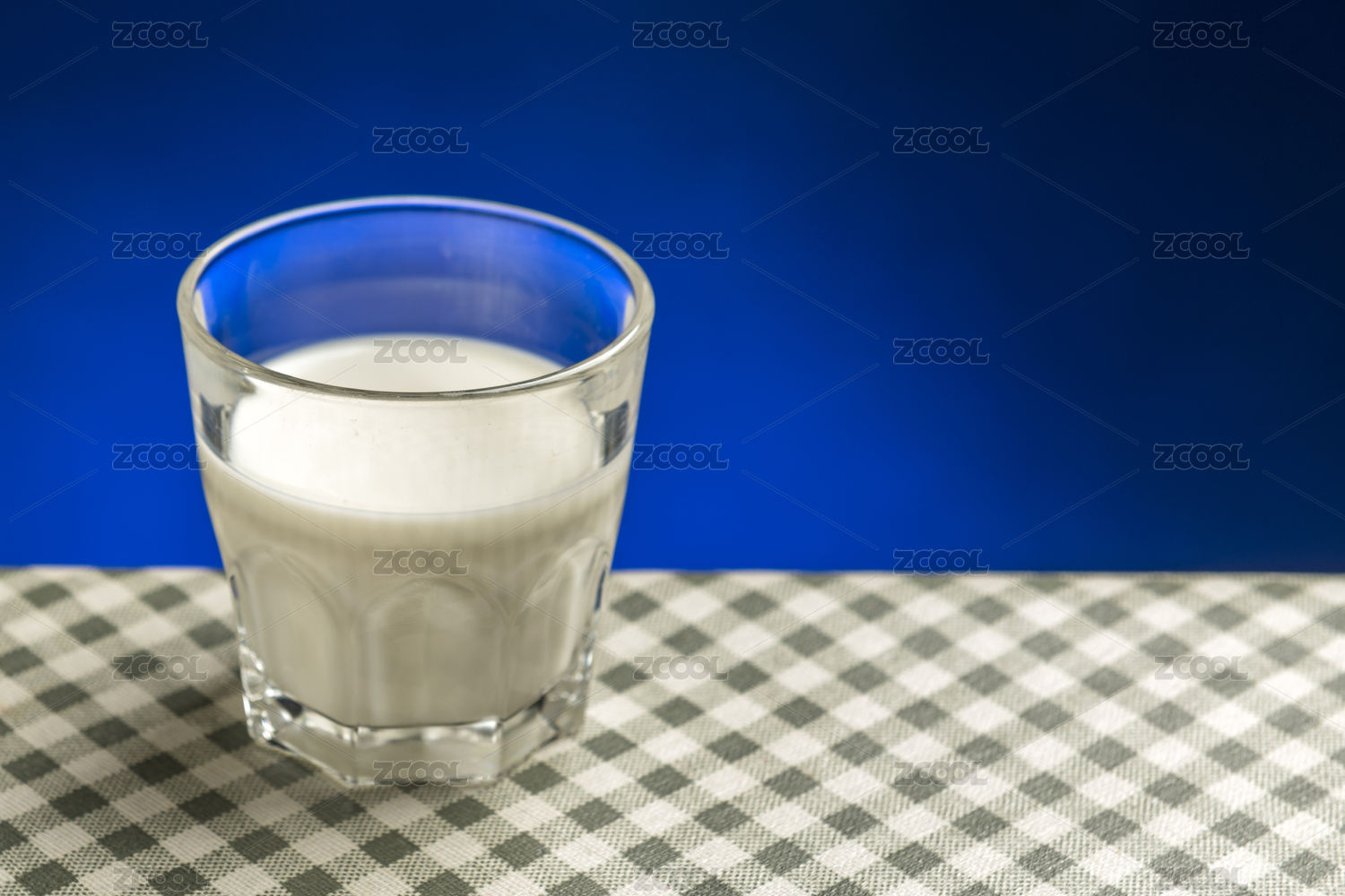 一杯牛奶摆放在格子桌布上特写