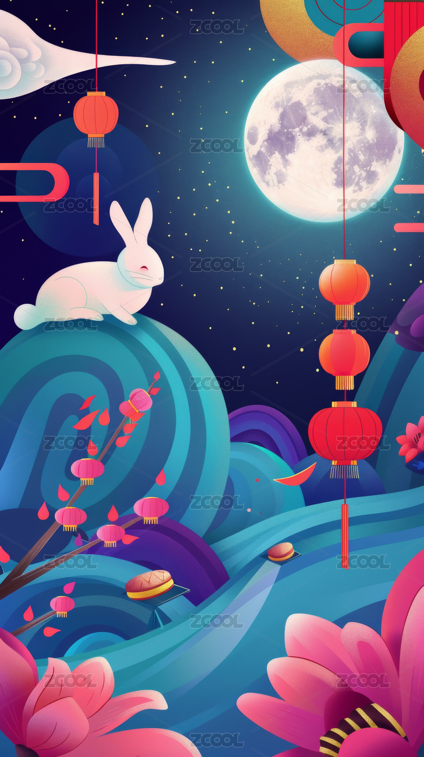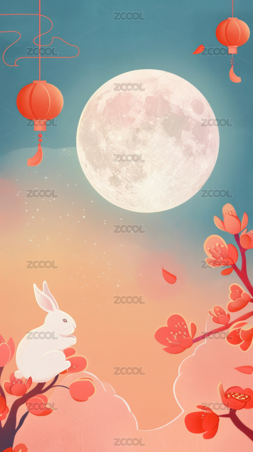 兔子玉兔桂花灯笼月亮可爱扁平插画