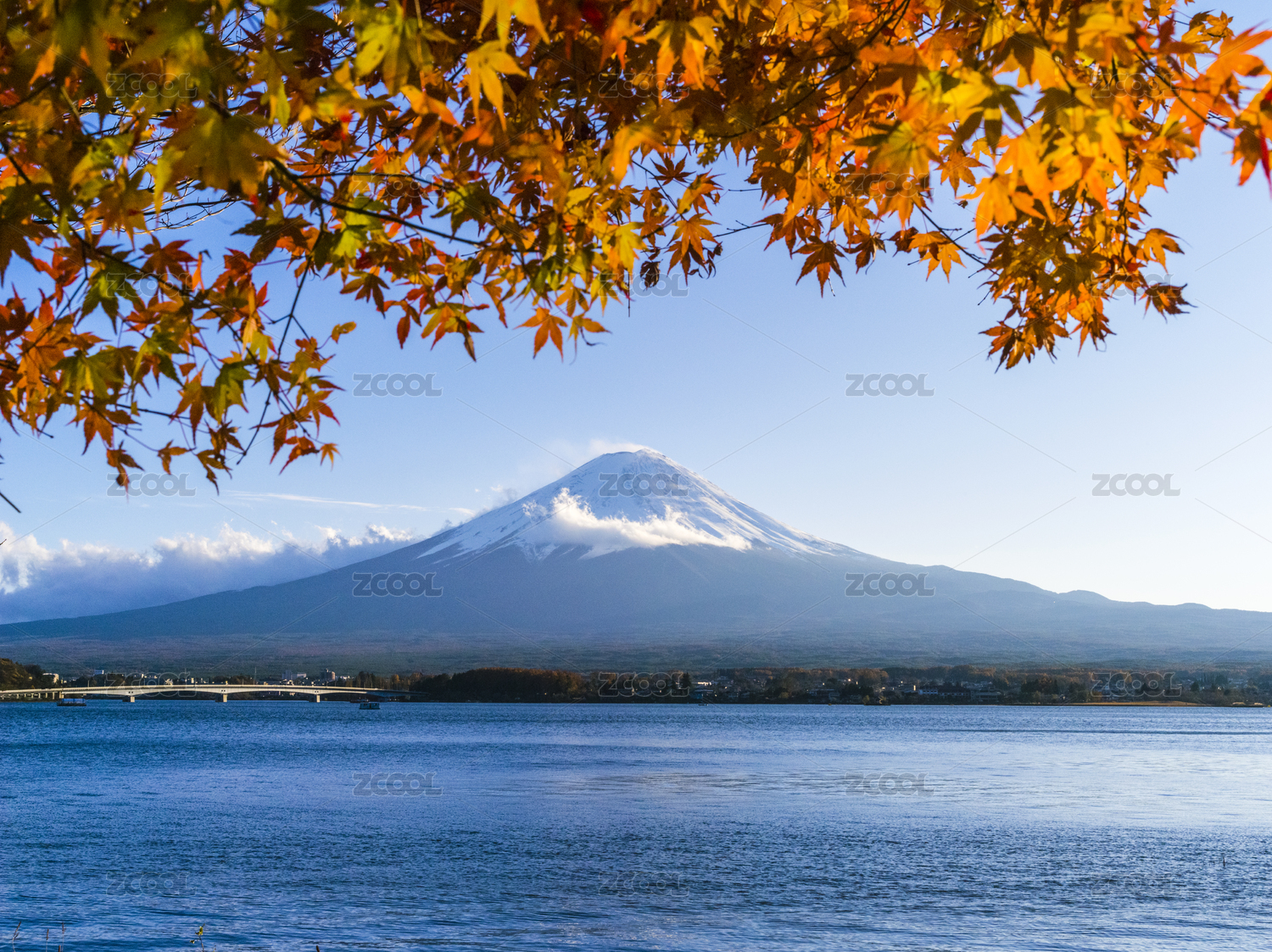 日本山梨县河口湖,清晨日出时被晨光染色的富士山