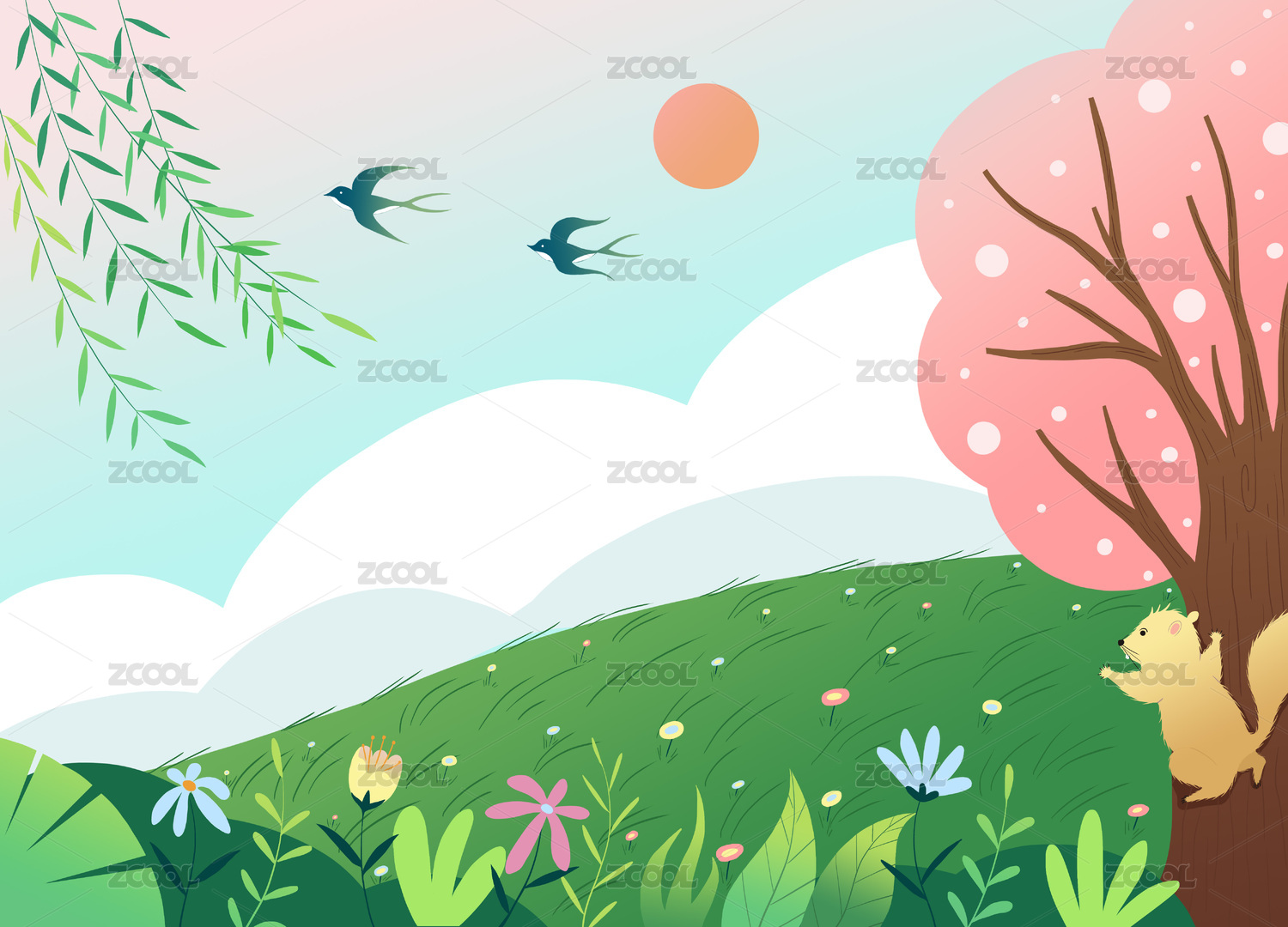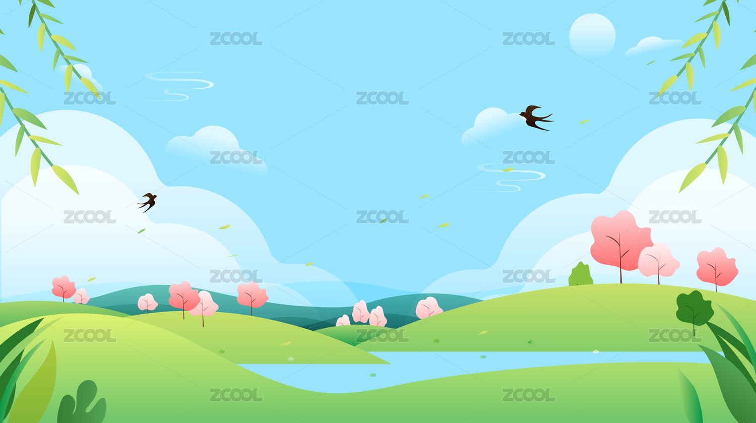 矢量春天风景草地柳枝燕子
