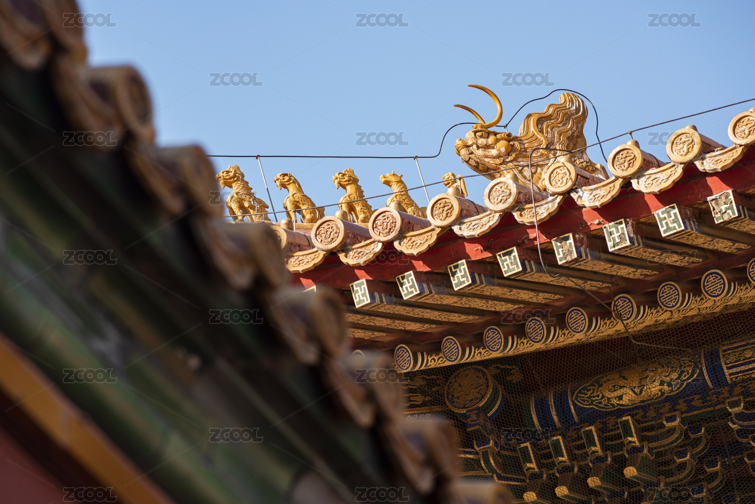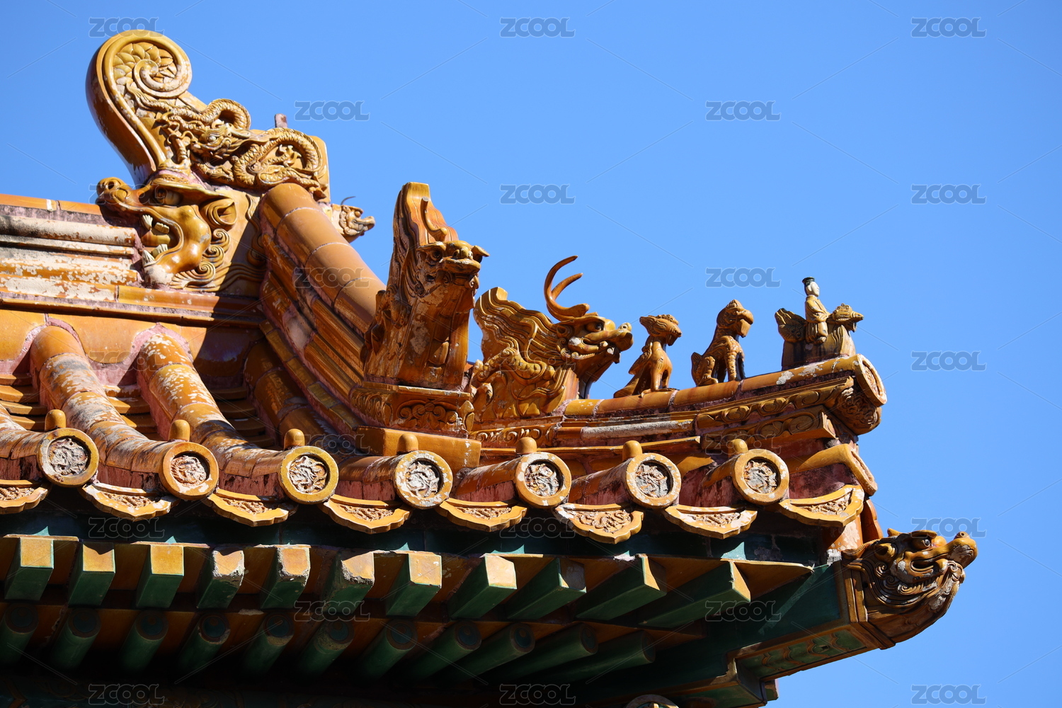 北京故宫的屋脊与琉璃瓦屋脊兽的雕刻