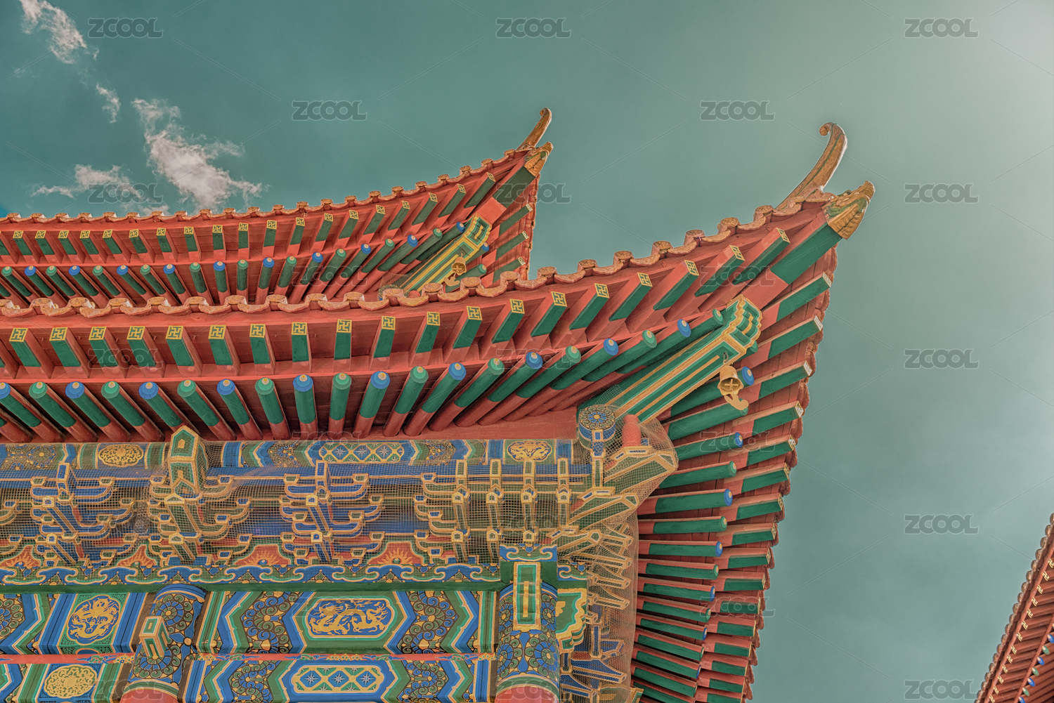 蓝天白云下大殿飞檐翘角,中国山东省寿光市宁国寺