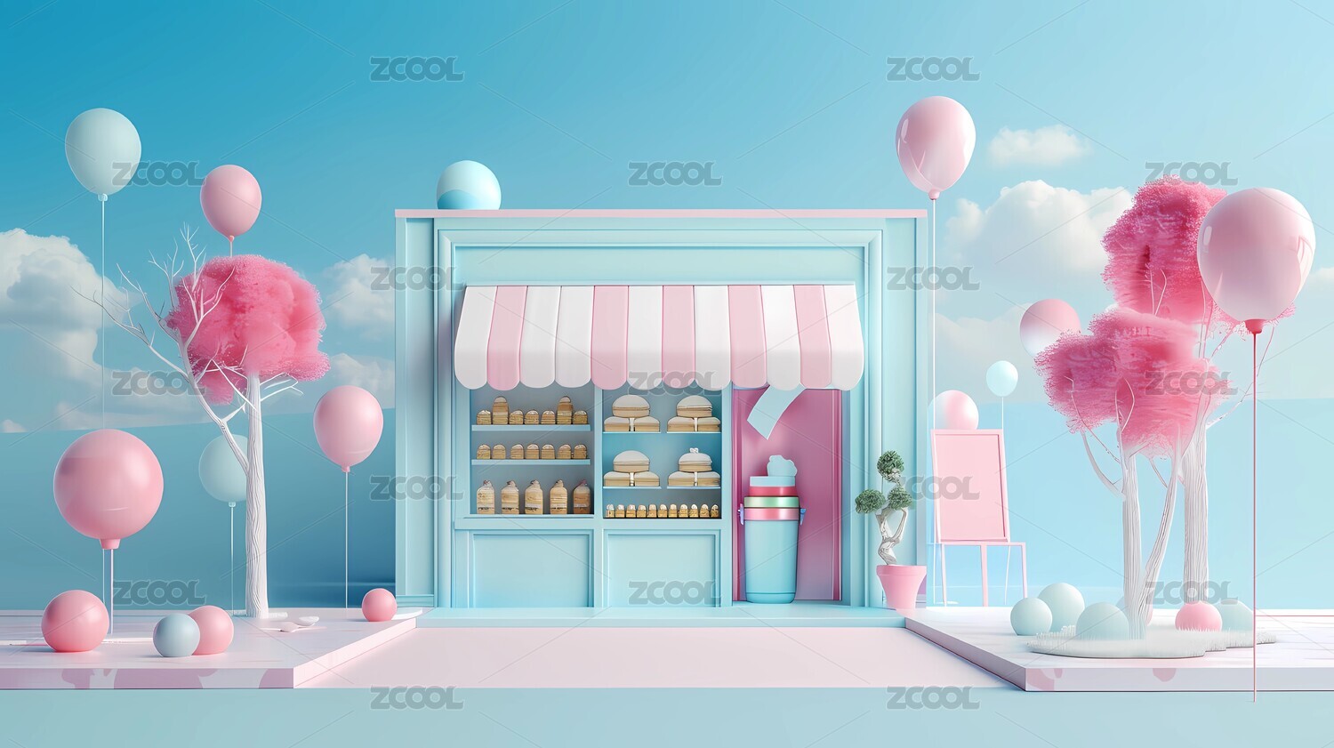 3D立体建筑云植物小店气球唯美场景