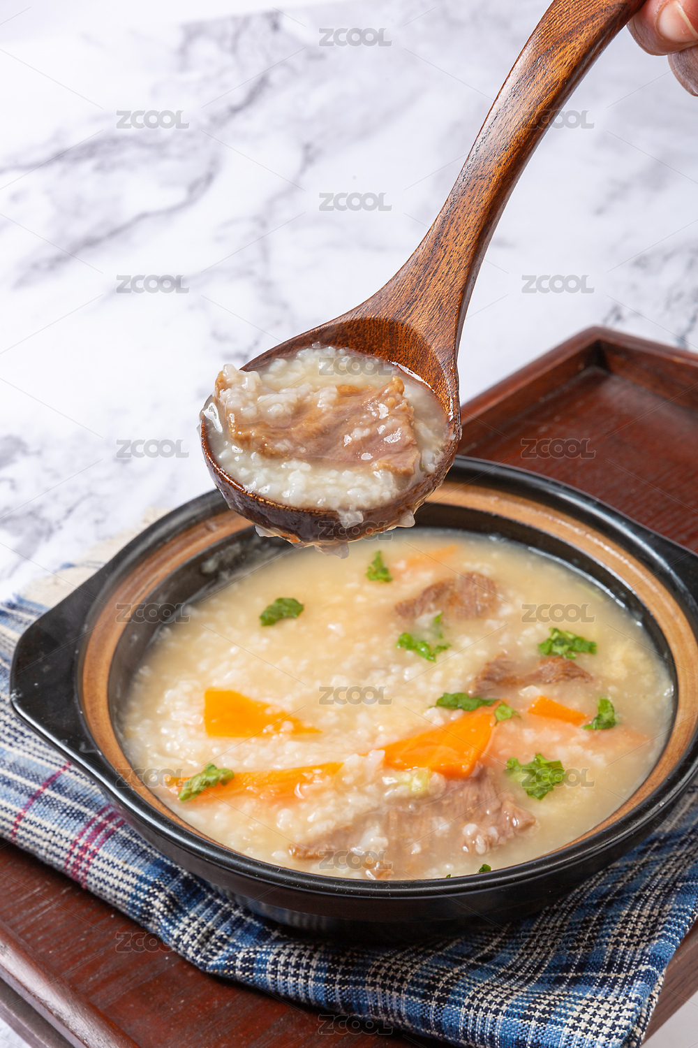 木桌上木盒里手柄沙锅里的香菇炒肉沙锅饭