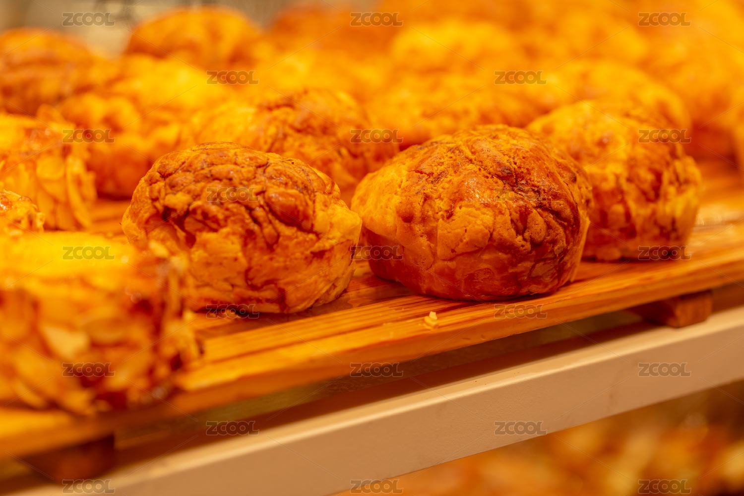 面包店玻璃柜里放置各种新鲜出炉烘焙糕点