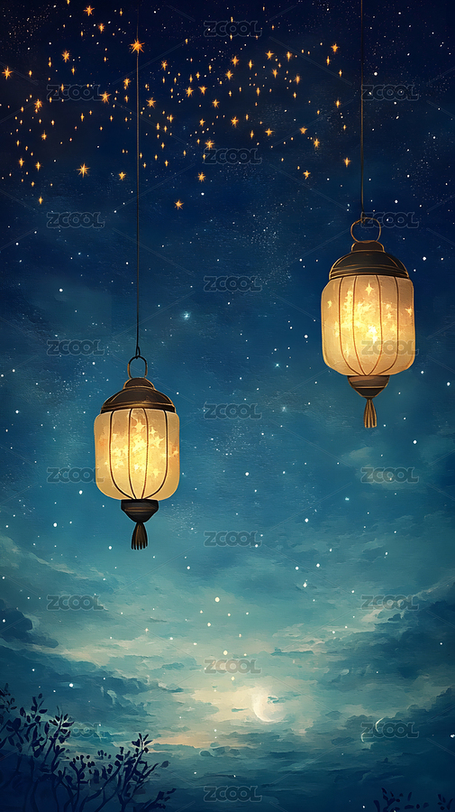 梦幻,插画,壁纸,背景,夜空,艺术,场景,灯笼,氛围,月亮